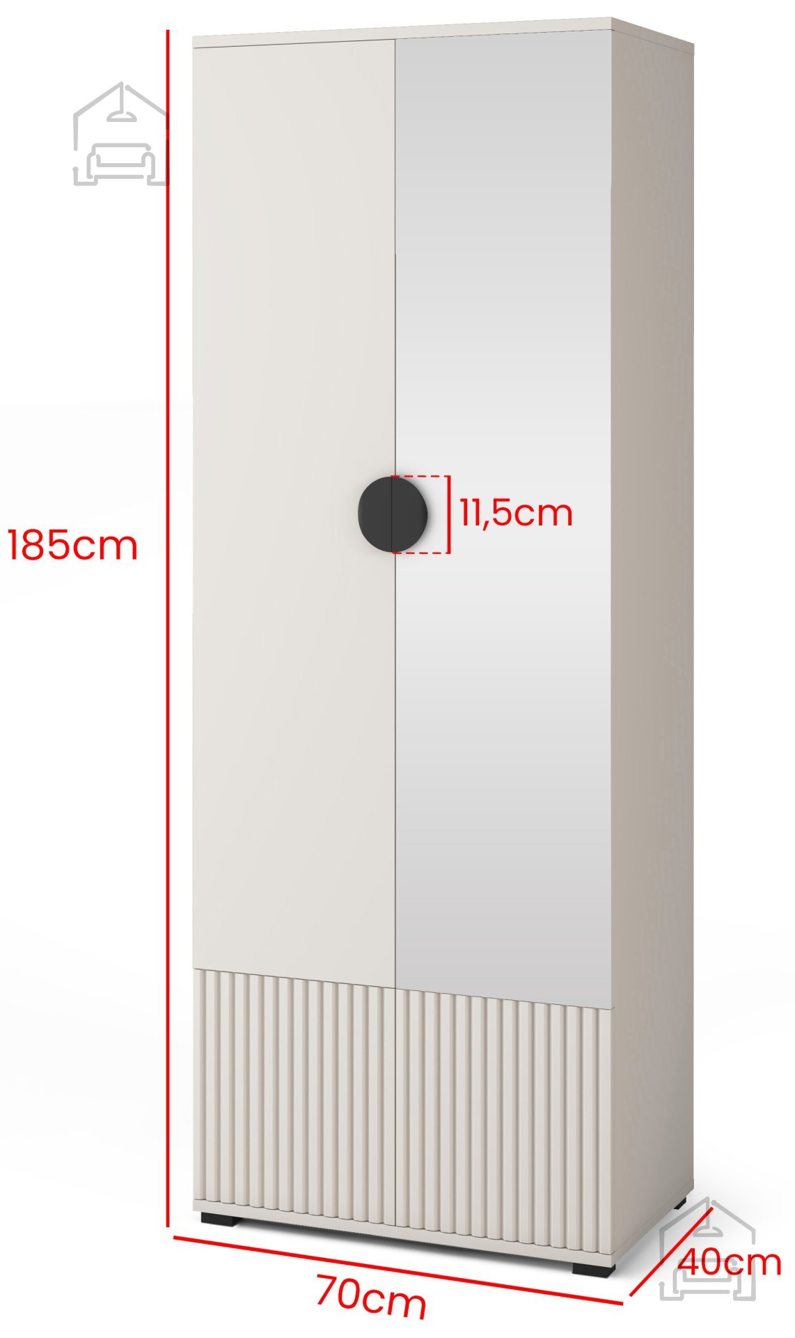Der Kleiderschrank Rayo mit Spiegel ist ein unverzichtbares Accessoire für jedes Zuhause, das Stil, Funktionalität und Langlebigkeit vereint. Mit seinen Maßen von 70x40x185 cm ist er die ideale Lösung für die optimale Organisation Ihrer Kleidung und Accessoires und verleiht gleichzeitig jedem Raum mit der Farbe Cashmere einen Hauch von Eleganz.