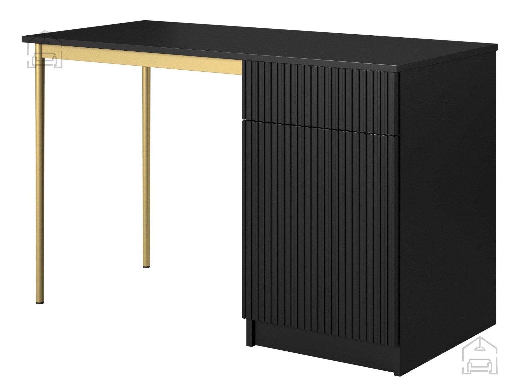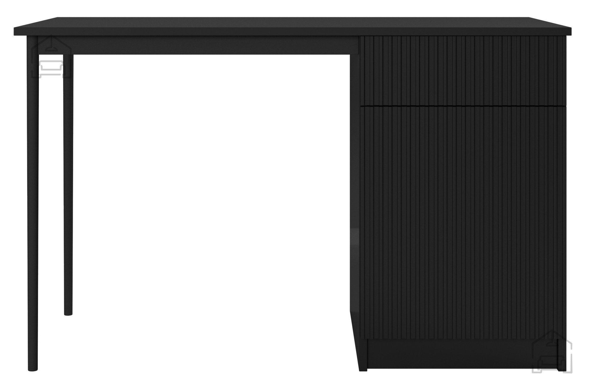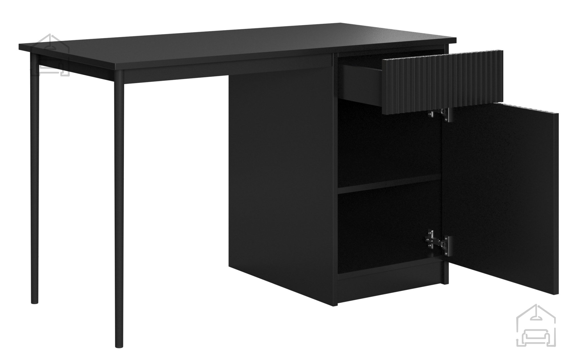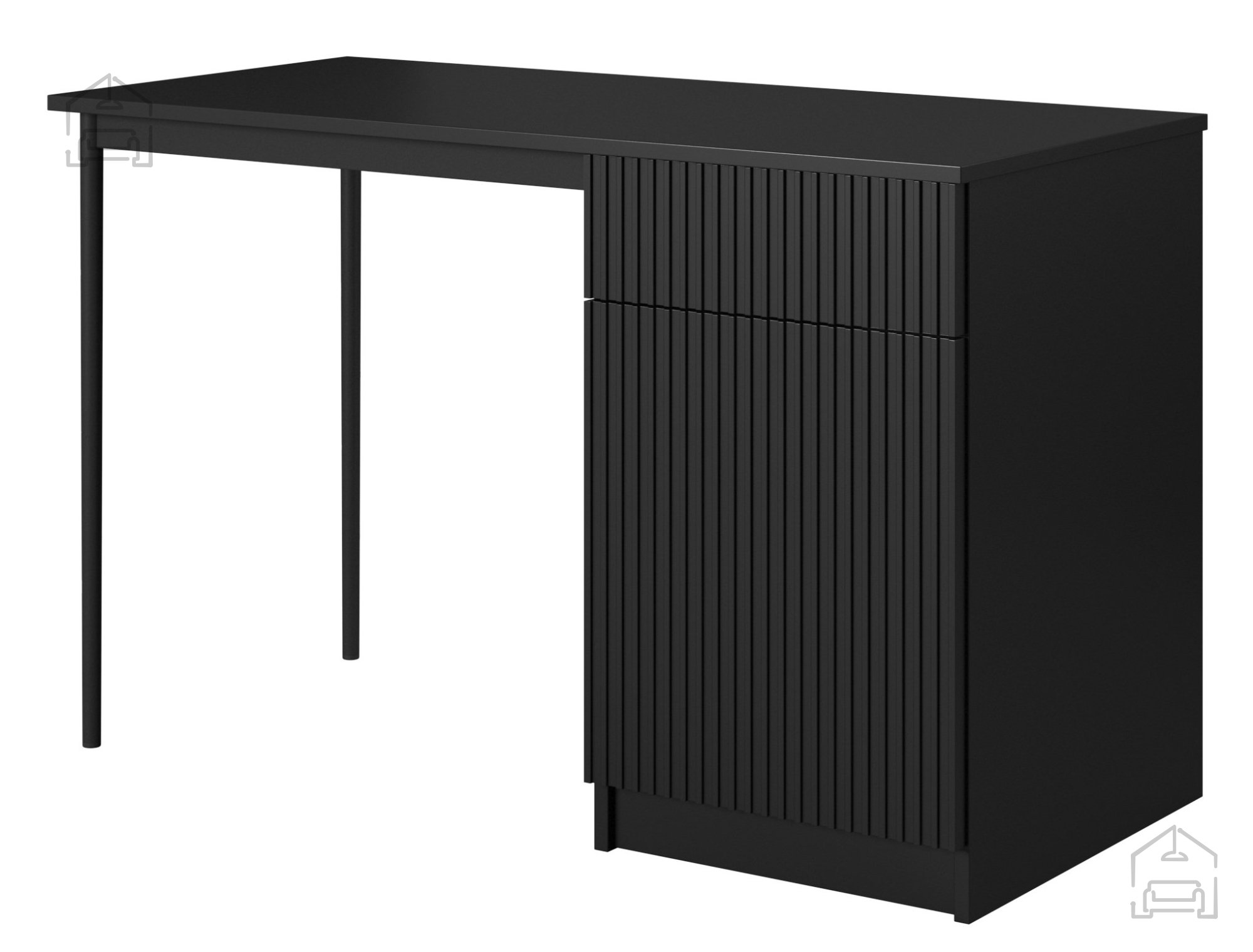 Ästhetik und Stil: Der Schreibtisch Nicole 120 1D1SZ in Schwarz mit elegantem Rillenmuster auf den Fronten verkörpert zeitlose Klassik mit modernem Touch. Die klaren Linien und die matte Oberfläche schaffen einen edlen Look, der sich harmonisch in jedes Zuhause oder Büro einfügt.