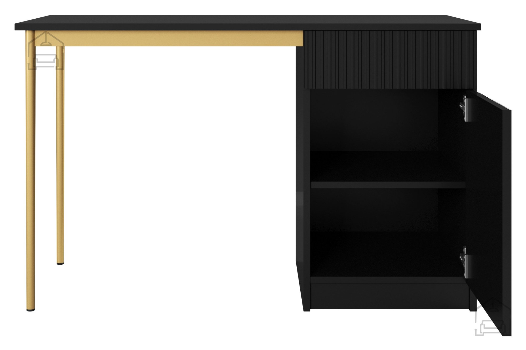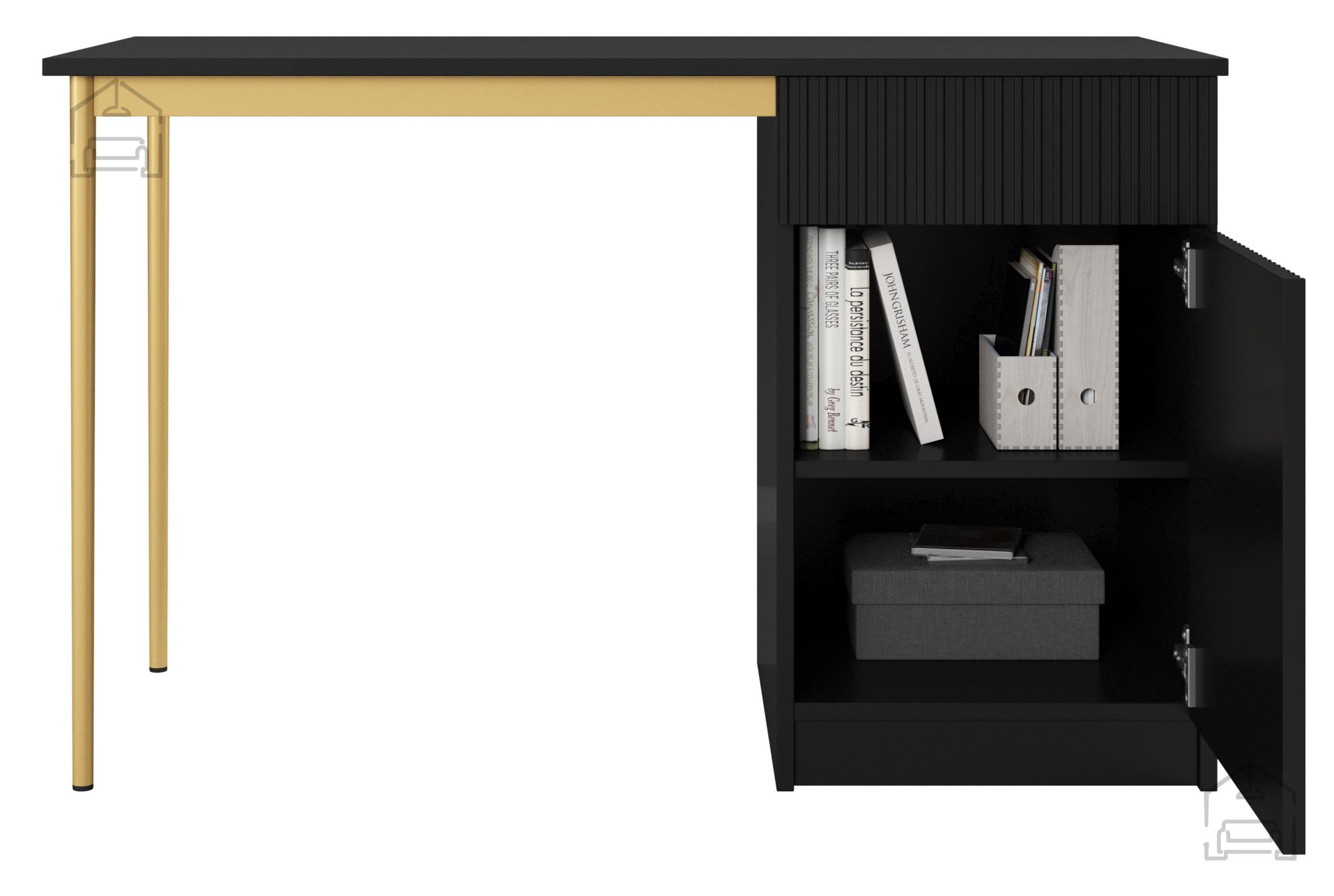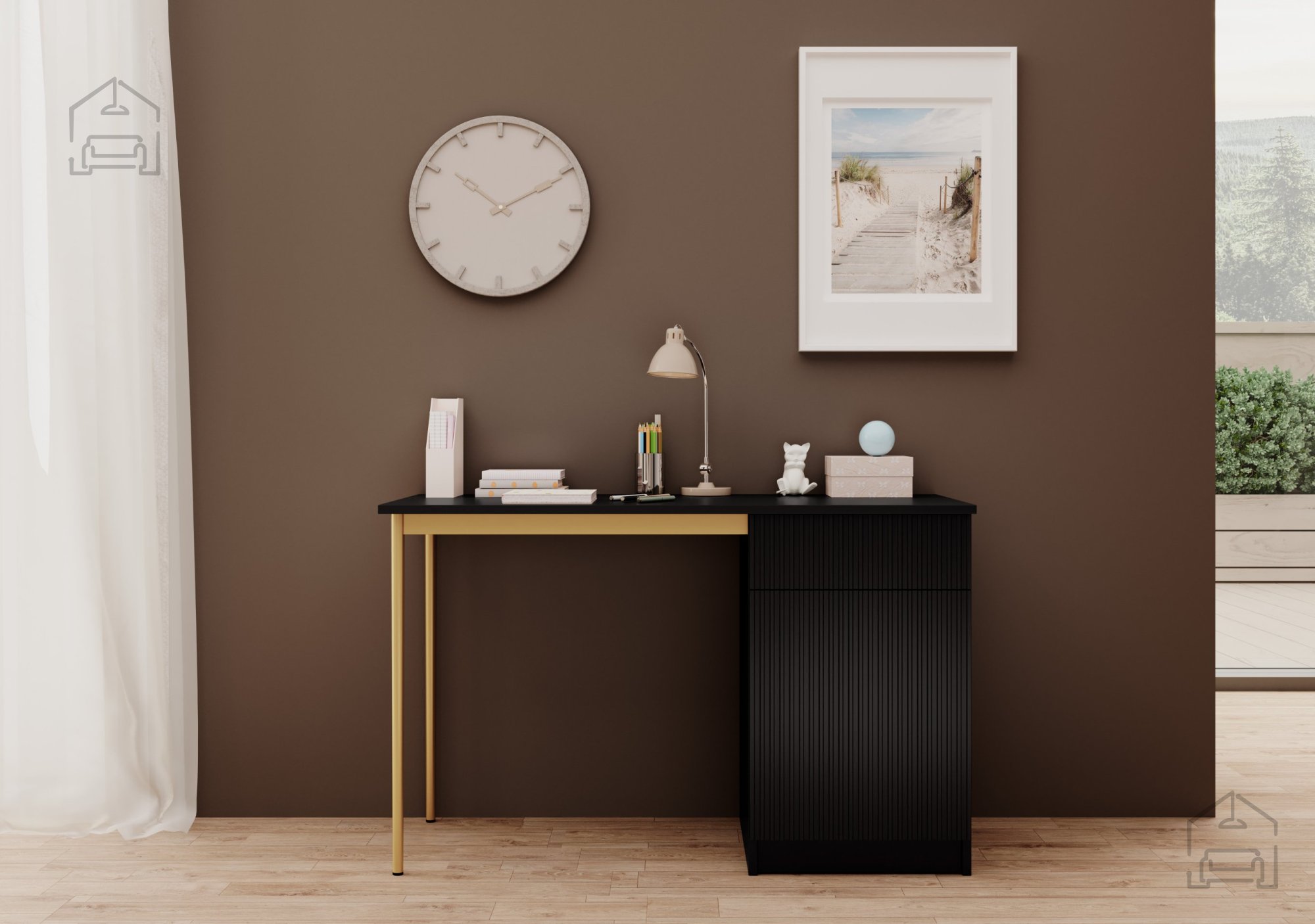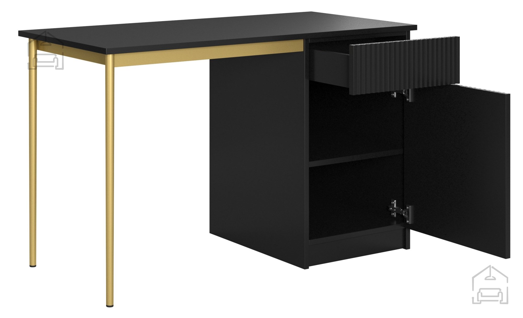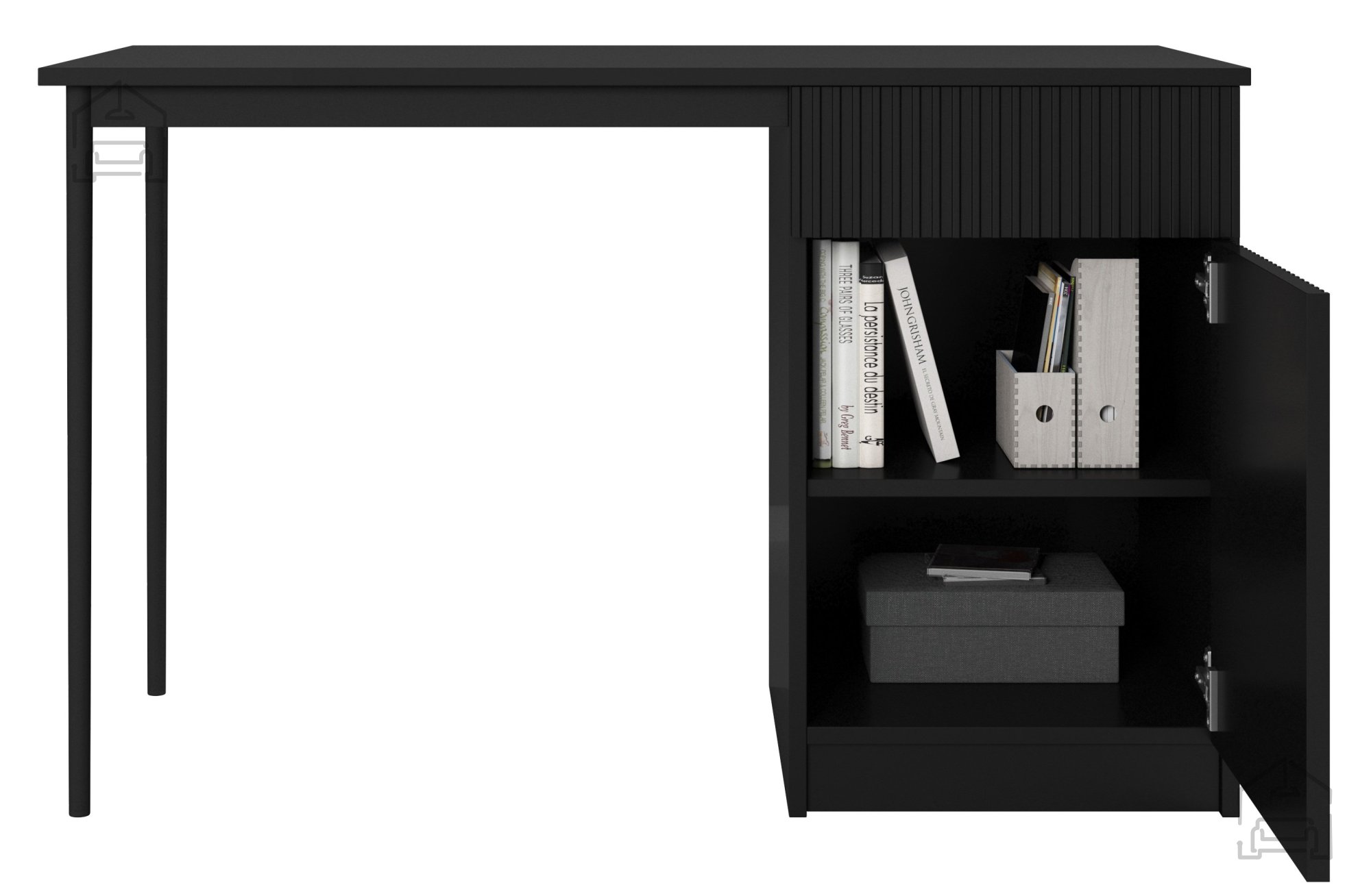 Ästhetik und Stil: Der Schreibtisch Nicole 120 1D1SZ in Schwarz mit elegantem Rillenmuster auf den Fronten verkörpert zeitlose Klassik mit modernem Touch. Die klaren Linien und die matte Oberfläche schaffen einen edlen Look, der sich harmonisch in jedes Zuhause oder Büro einfügt.