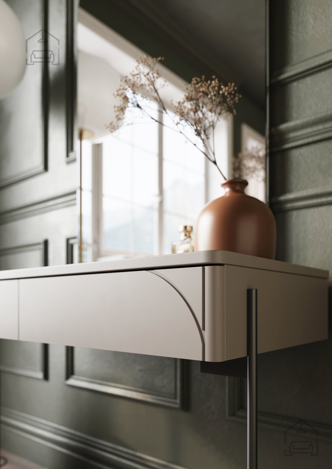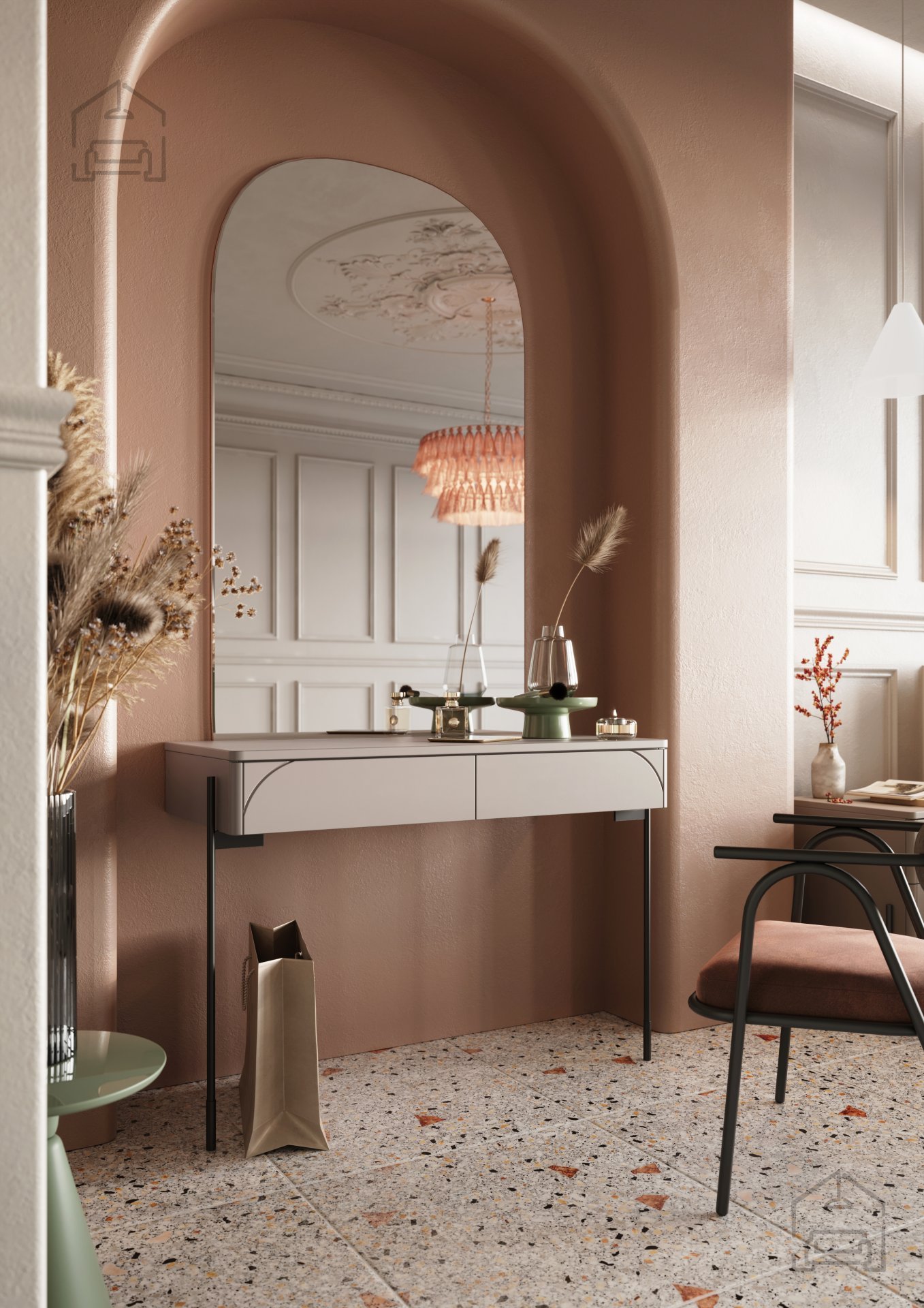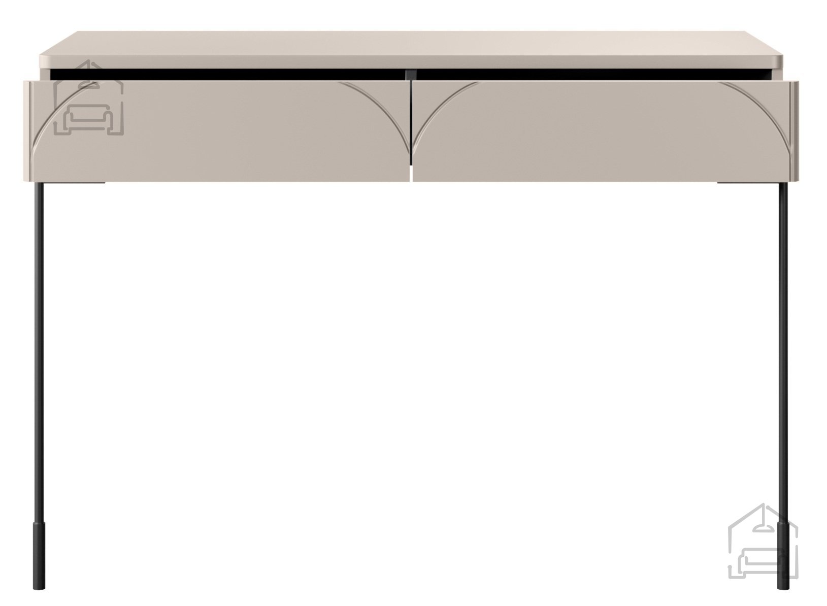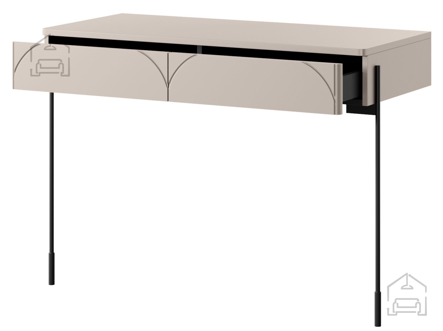 Die elegante Kaschmirfarbe verleiht dem Raum eine angenehme, ruhige Atmosphäre und lässt sich leicht mit anderen Möbelstücken kombinieren. Die schwarzen, pulverbeschichteten Metallbeine unterstreichen das moderne Design und bieten gleichzeitig zusätzlichen Schutz vor Abnutzung. Durch das minimalistische Erscheinungsbild fügt sich der Schminktisch Sonatia 100 2SZ harmonisch in sowohl moderne als auch klassische Einrichtungen ein.