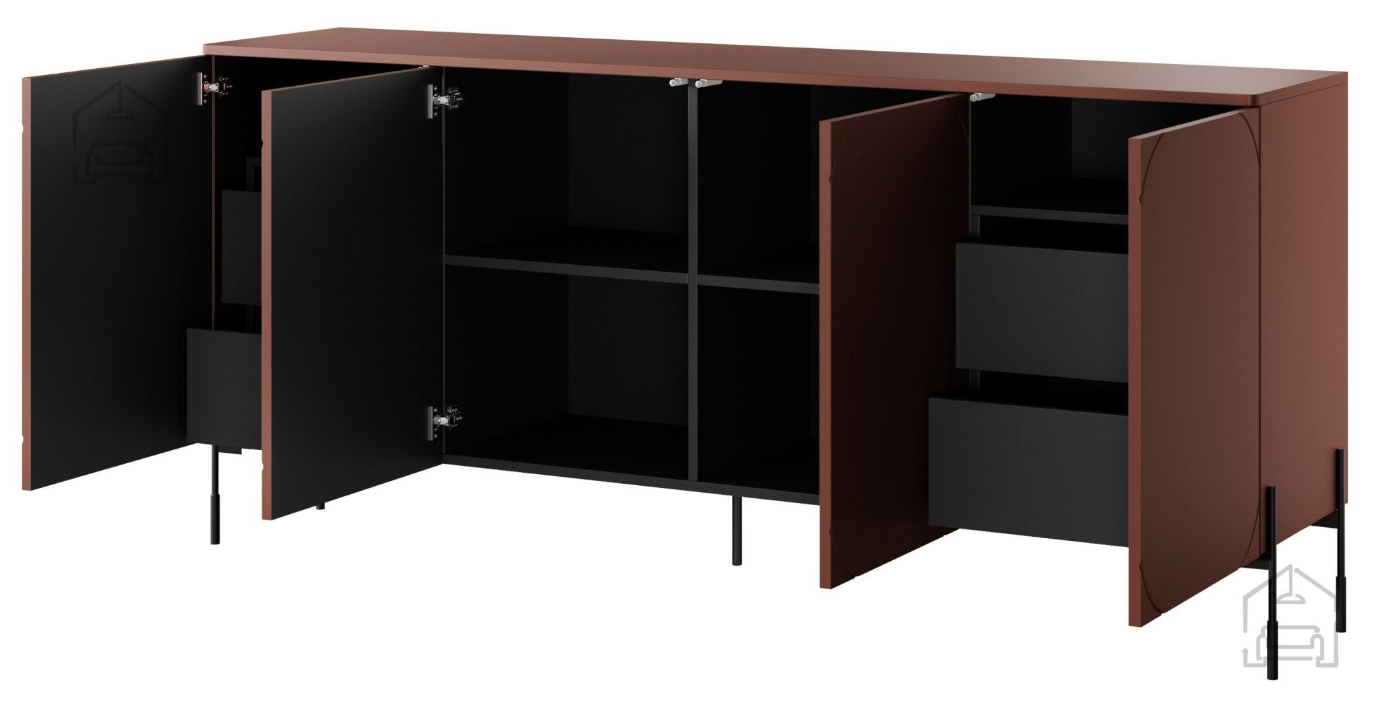 Die Kommode Sonatia 200 4D4SZ ist mehr als nur ein Aufbewahrungsmöbel – sie ist ein stilvolles Statement, das Ihrem Raum einen Hauch von Luxus und Moderne verleiht. Das Zusammenspiel von Burgunderrot und schwarzen Elementen schafft einen spannenden Kontrast, der Ihren Wohnraum aufwertet und Charakter verleiht.
