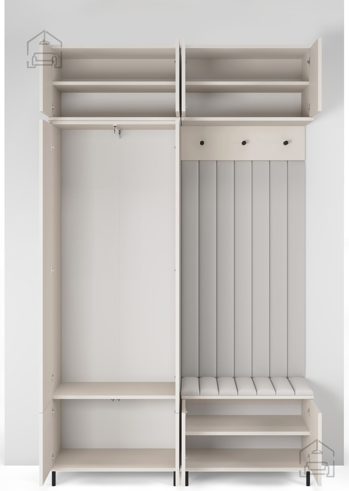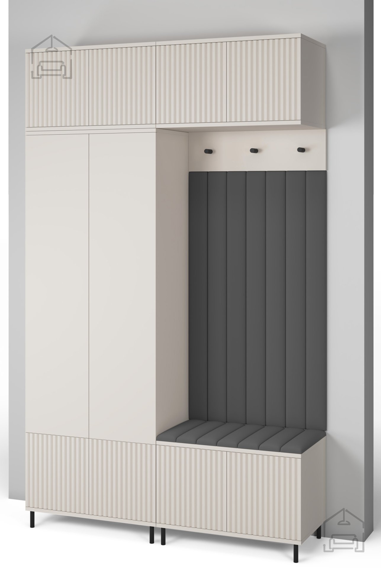 Izdelan iz 16 mm laminirane plošče, komplet za hodnik Rayo 2 združuje trpežnost in eleganco. Barva cashmere vnese nežnost in prefinjenost, ki se popolnoma ujema z različnimi notranjimi slogi. Kovinske nogice, visoke 12 cm, zagotavljajo stabilnost in dodajajo sodoben pridih celotnemu dizajnu. Tkanina Trinity 15, uporabljena na sliki, dopolnjuje celoten videz s svojo mehko teksturo in estetskim videzom.