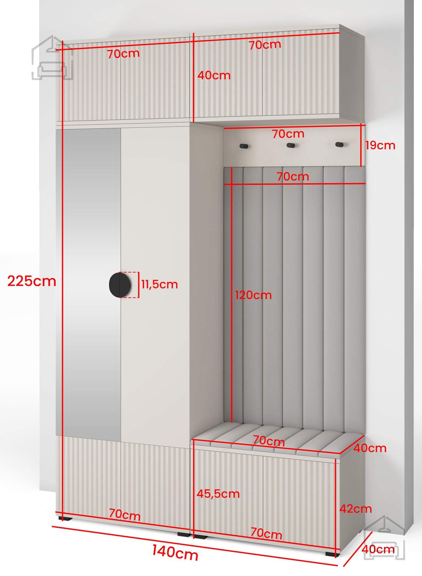 Das Drucköffnen ist einer der Hauptvorteile dieses Sets, da es ein komfortables und modernes Nutzungserlebnis bietet. Ohne unnötige Griffe und komplizierte Mechanismen ermöglicht diese Funktion einen schnellen und einfachen Zugriff auf Ihre Sachen im Flur. Darüber hinaus vergrößert der im Set enthaltene Spiegel nicht nur optisch den Raum, sondern bietet auch zusätzliche Funktionalität, da Sie sich schnell fertig machen können, bevor Sie das Haus verlassen.