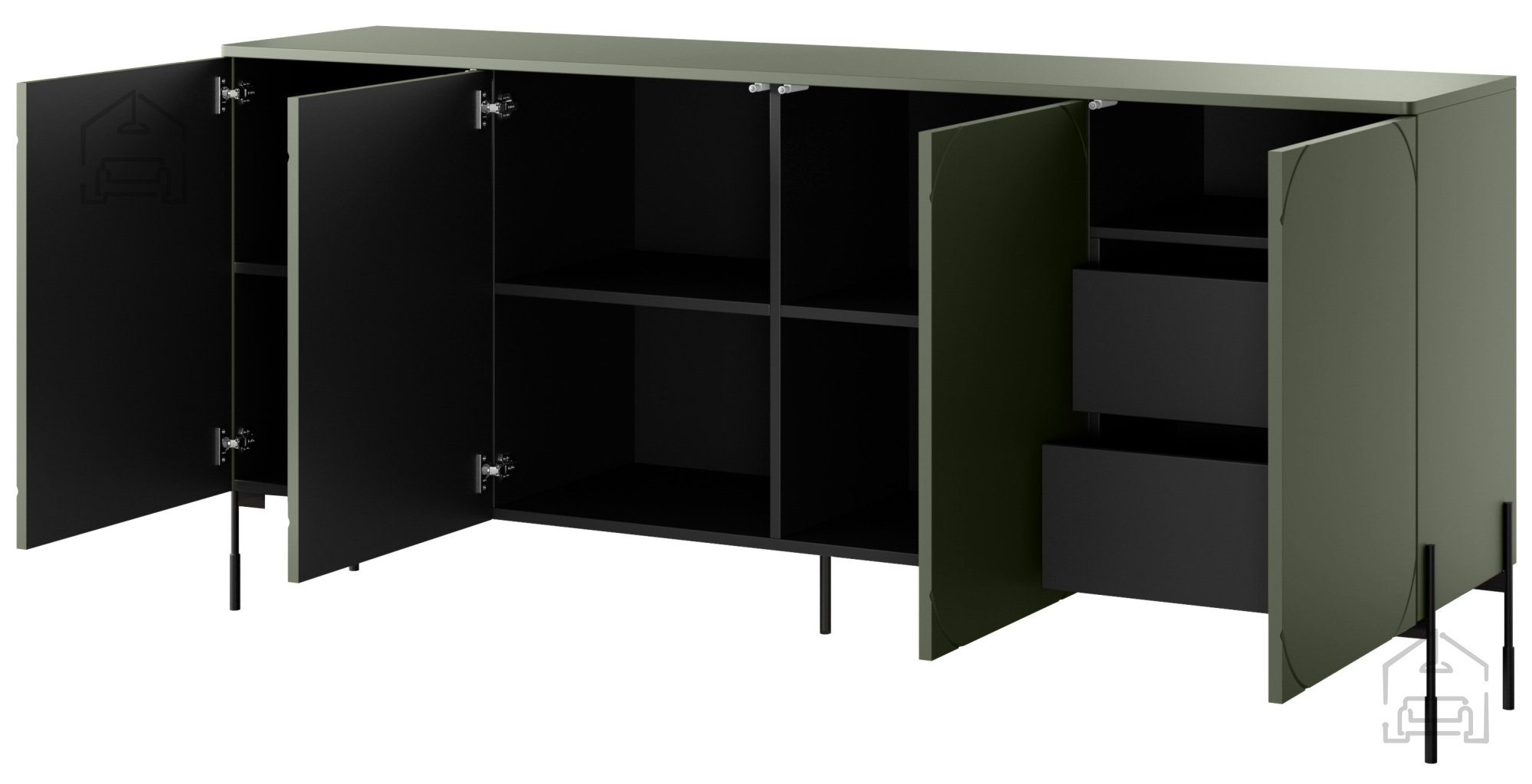 Die Kommode Sonatia besteht aus erstklassigen Materialien, die Langlebigkeit und ein ansprechendes Erscheinungsbild garantieren. Die 18 mm starke Möbelplatte ist mit einer supermatten PVC-Folie überzogen, die der Oberfläche einen modernen, glatten Look verleiht. Das Olivgrün sorgt für Frische und Harmonie und lässt sich wunderbar mit verschiedensten Einrichtungsstilen kombinieren. Schwarze Details – darunter ABS-Kanten und eine 3 mm starke HDF-Rückwand – setzen stilvolle Akzente und betonen die elegante Linienführung. Die pulverbeschichteten Metallbeine in Schwarz sind 20 cm hoch, bieten Stabilität und unterstreichen das moderne Design.