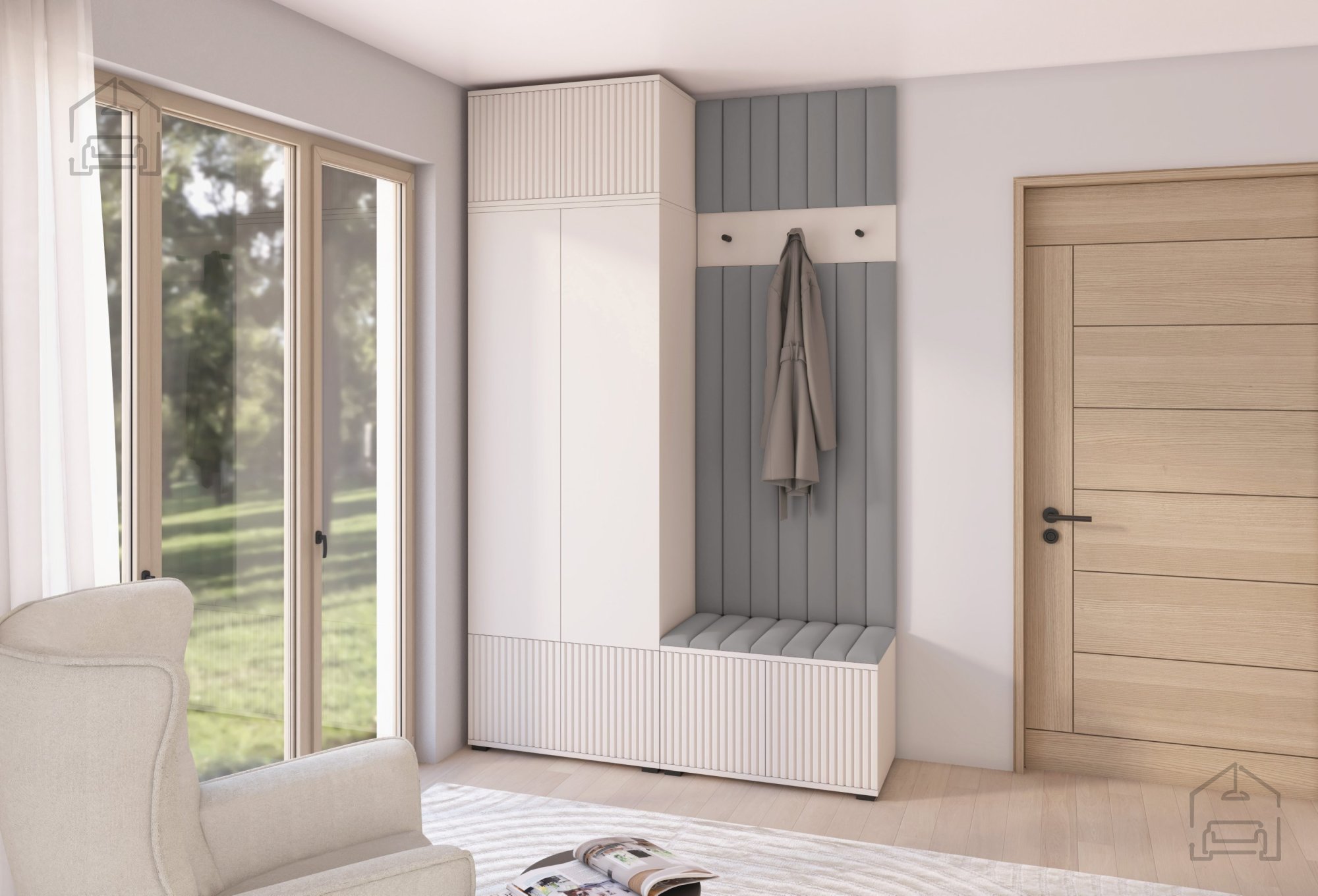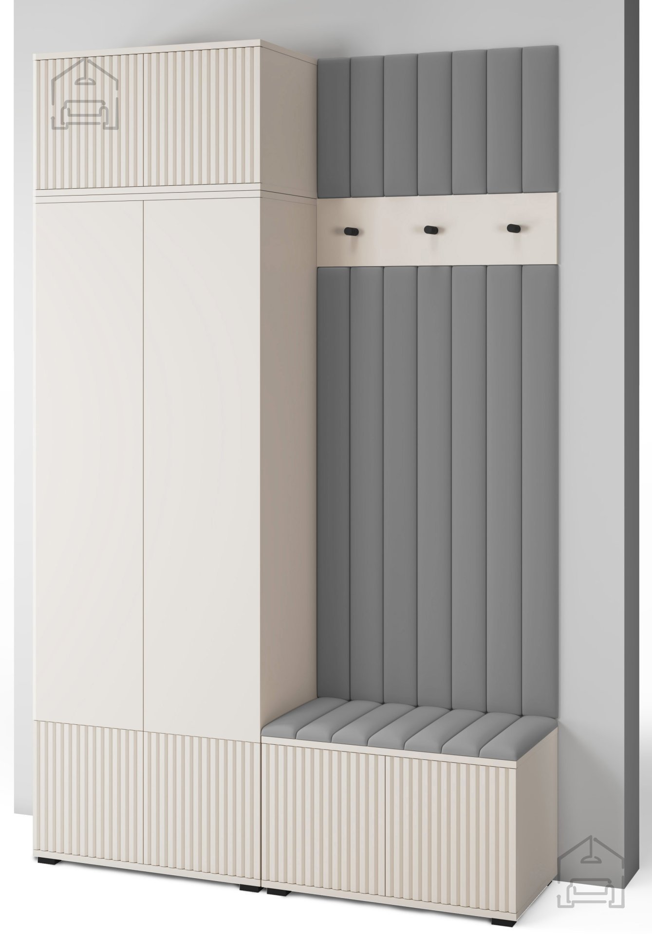 Polsterung und Details: Das Besondere an diesem Set sind die gepolsterten Paneele aus dem Stoff Trinity 14, die nicht nur die Ästhetik verbessern, sondern auch zusätzlichen Komfort bieten. Die Fräsungen an den Fronten betonen das moderne Design und die Einzigartigkeit des Sets.