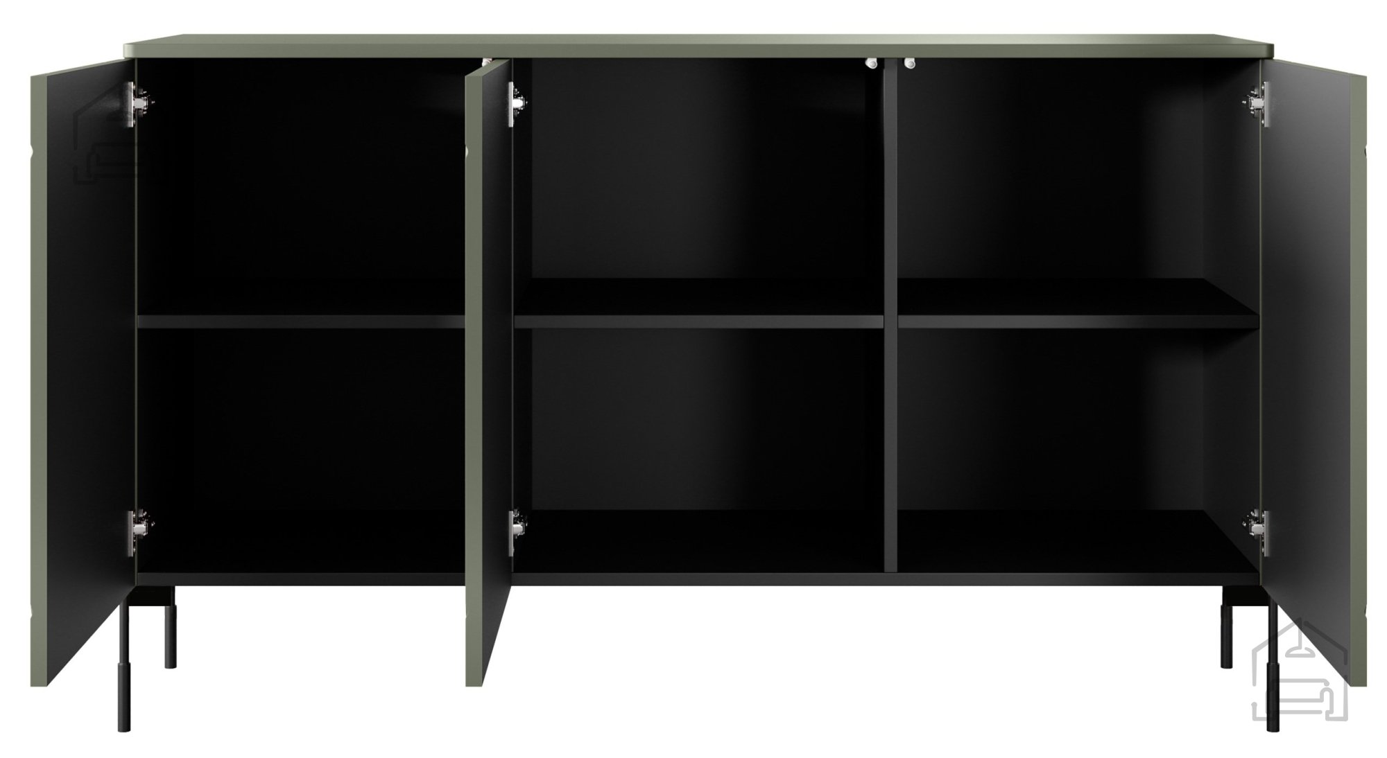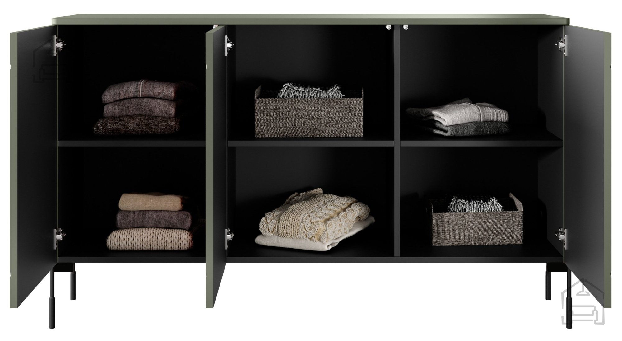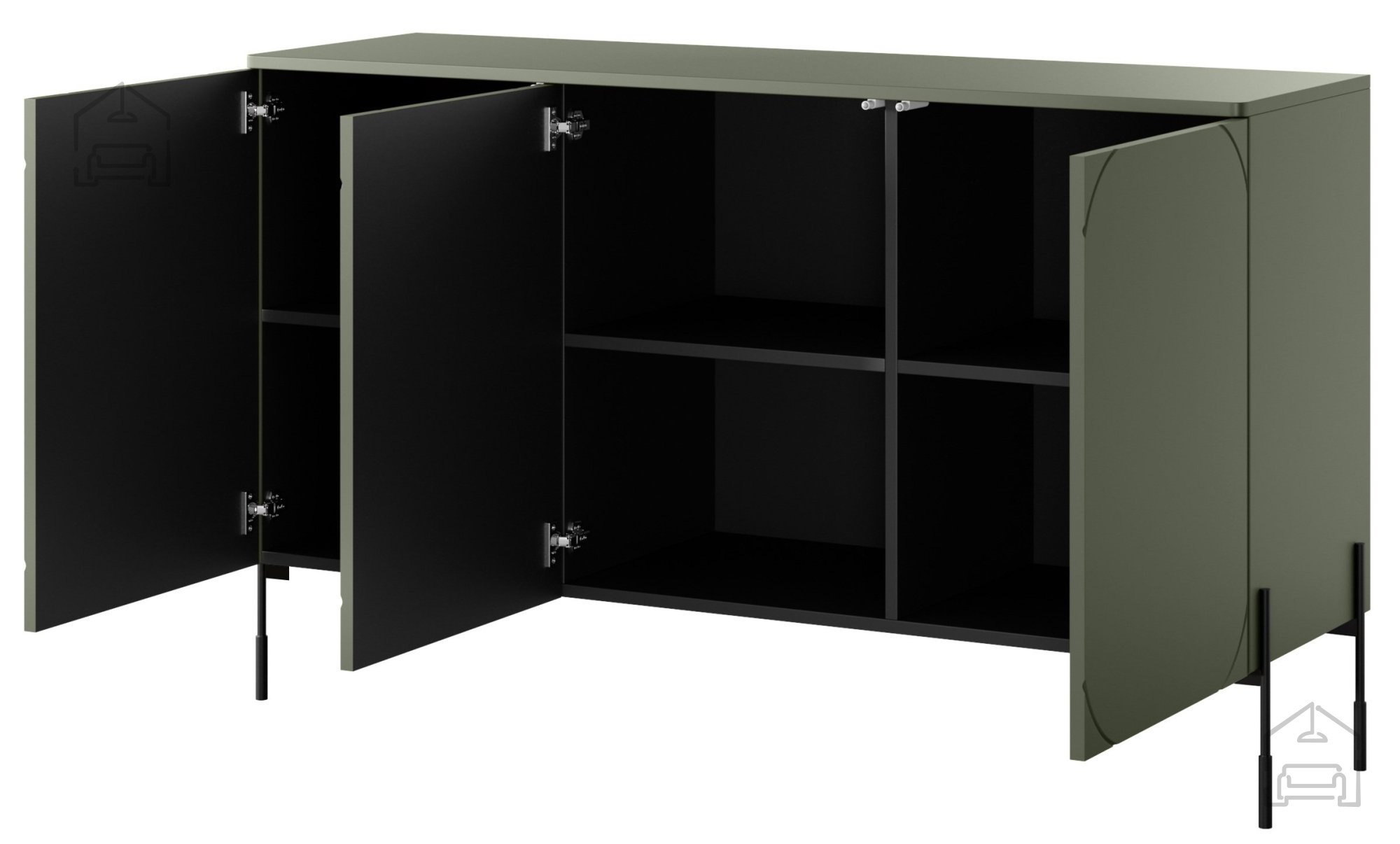 Die Kommode Sonatia wird aus hochwertigen Möbelplatten mit einer Stärke von 18 mm gefertigt und mit einer supermatten PVC-Folie überzogen. Diese Materialkombination sorgt für Langlebigkeit und eine widerstandsfähige Oberfläche, die ihren schönen Look viele Jahre lang behält. Das Olivgrün verleiht dem Möbel ein frisches, modernes Flair, das sich harmonisch in verschiedenste Einrichtungsstile einfügt. Schwarze Elemente wie Beine und Ablagen setzen elegante Akzente und schaffen einen stilvollen Kontrast.