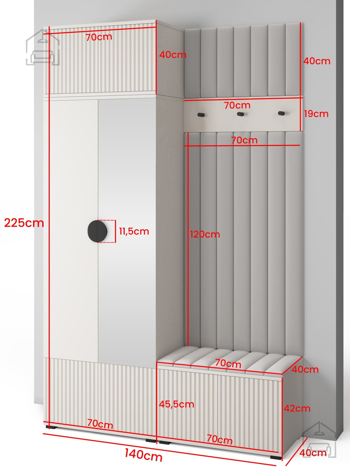 Das Garderobenset Rayo 4 mit Spiegel ist die perfekte Wahl für alle, die ihrem Flur Stil und Funktionalität verleihen möchten. Mit hochwertigen Materialien, raffiniertem Design und praktischen Lösungen ist dieses Set eine ausgezeichnete Investition zur Verbesserung Ihres Zuhauses. Gönnen Sie sich die Eleganz und den Komfort, die das Set Rayo 4 bietet.