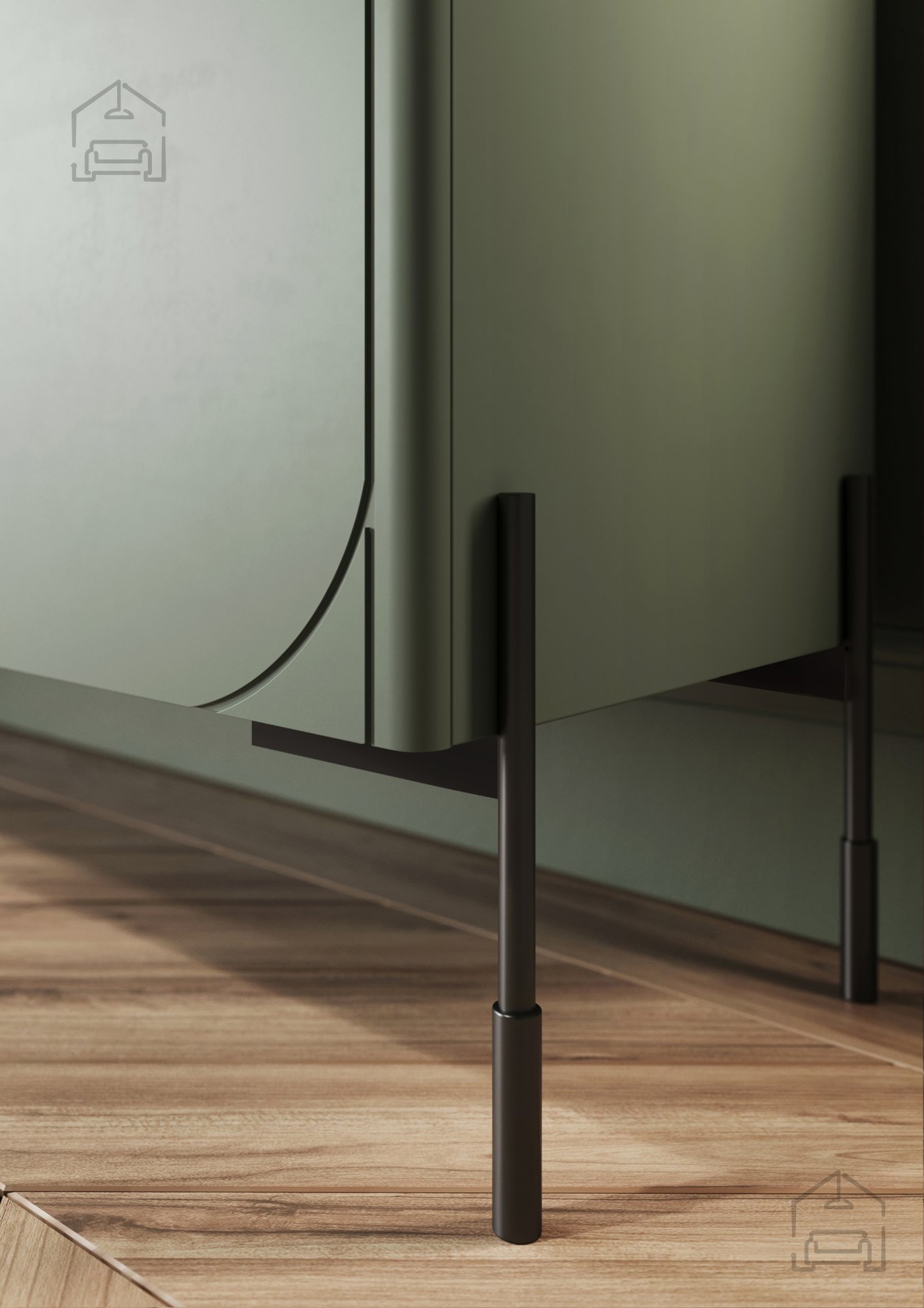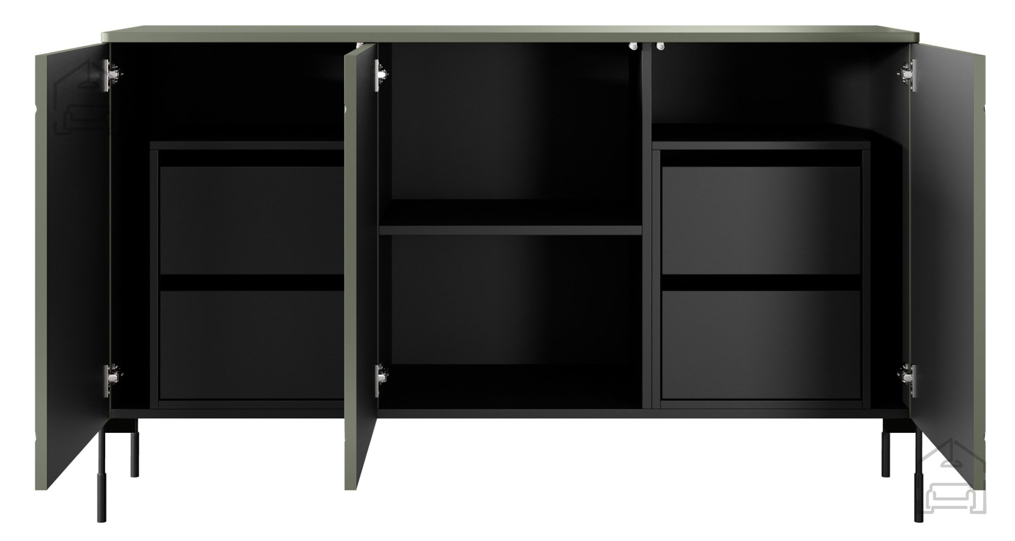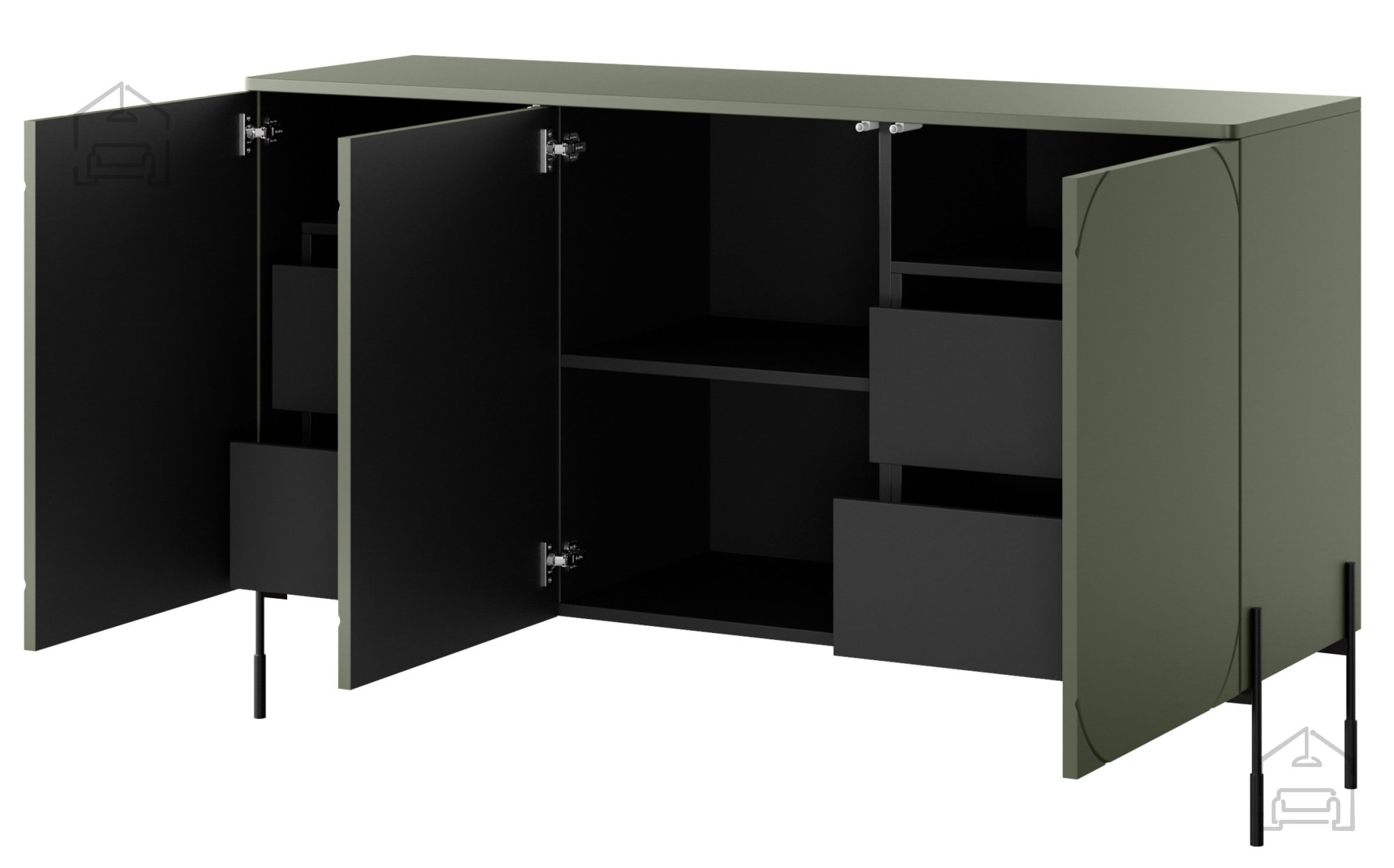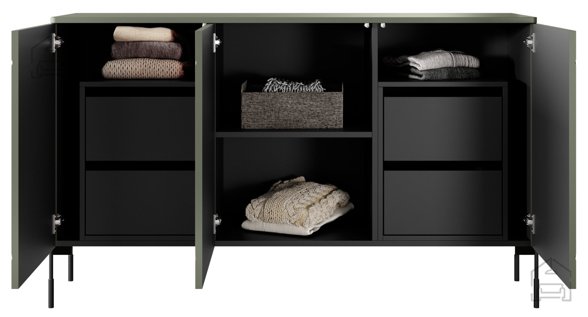 Die Kommode Sonatia 150 3D4SZ überzeugt mit ihrer eleganten Formgebung und einer cleveren Raumaufteilung. Mit den Gesamtmaßen von 154x45x90 cm bietet sie großzügigen Stauraum für Ihre Lieblingsstücke. Drei Türen und vier geräumige Schubladen sorgen dafür, dass alles seinen Platz findet. Das olivgrüne Finish in Kombination mit dem schwarzen Sockel, den Einlegeböden und den mittleren Elementen schafft einen modernen, aber dennoch zeitlosen Look, der wunderbar zu verschiedenen Einrichtungsstilen passt.
