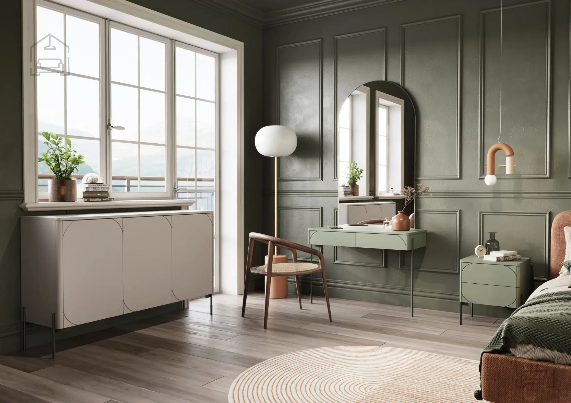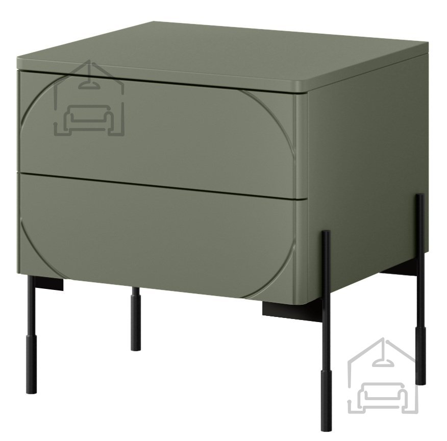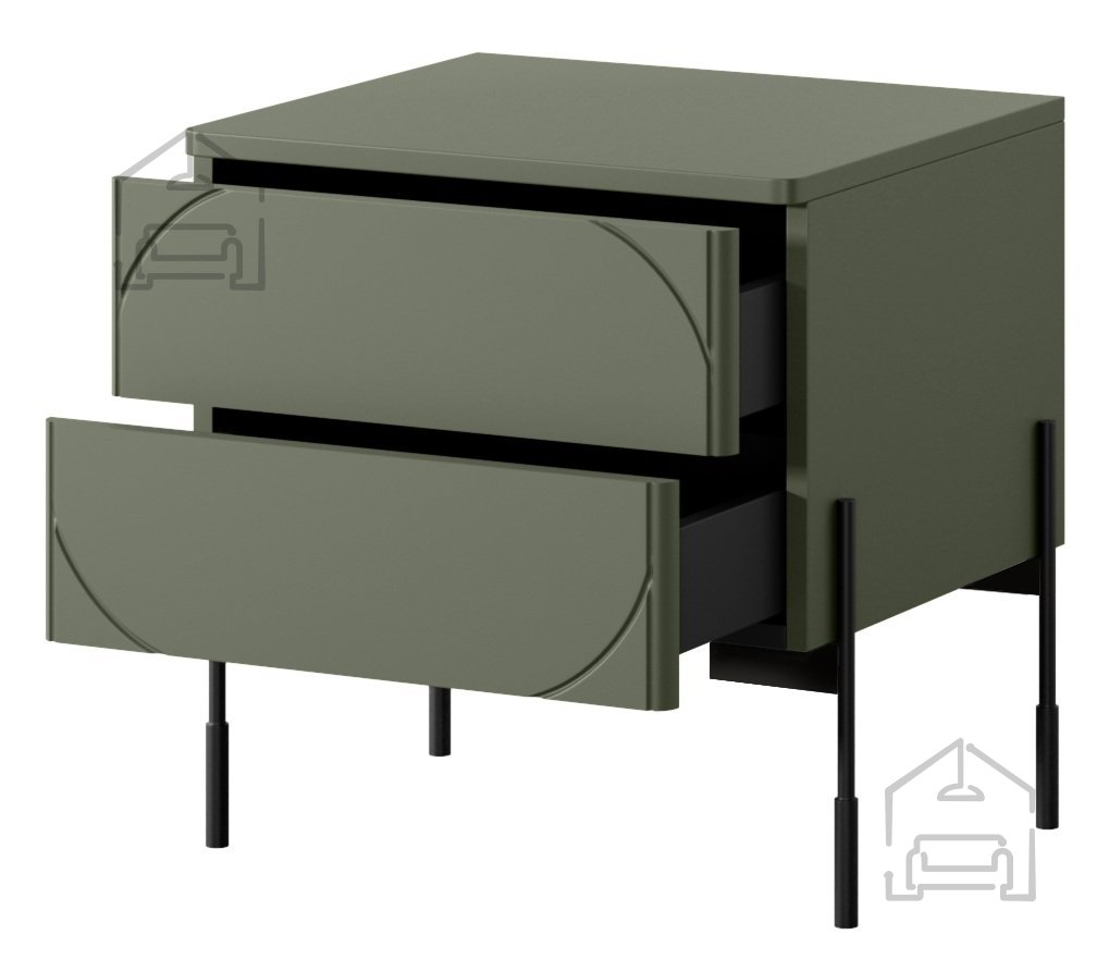 Bringen Sie einen Hauch von Stil und Funktionalität in Ihr Schlafzimmer mit dem Nachttisch Sonatia 45 2SZ. Dieses besondere Möbelstück aus hochwertiger Möbelplatte mit 18 mm Stärke ist die ideale Wahl für alle, die Wert auf edles Design und praktische Nutzung legen. Das olivgrüne Finish sorgt für eine ruhige, moderne Atmosphäre, während die schwarzen Elemente – Sockel, Ablagen und Mittelteil – dem Ganzen eine elegante Note verleihen.