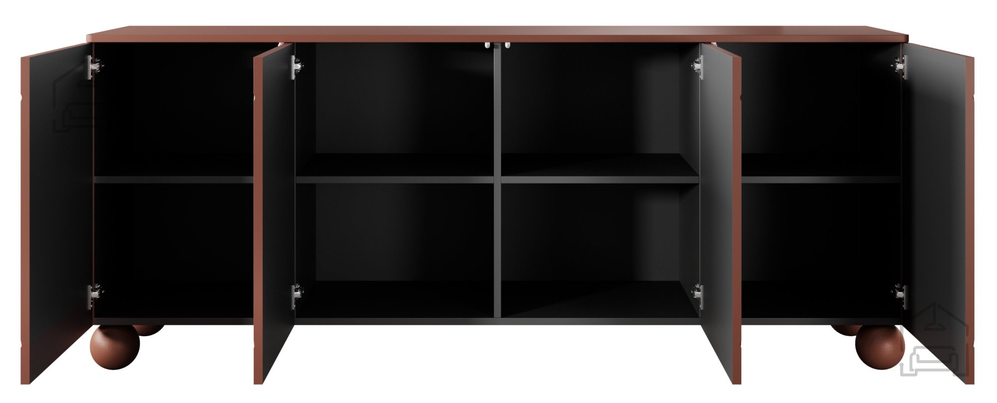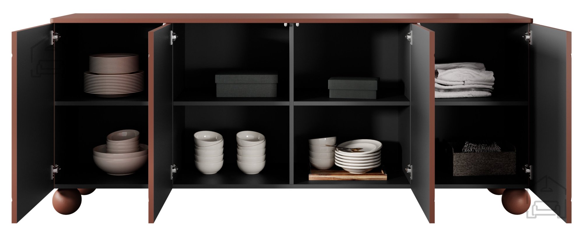Die Kombination aus schwarzer Basis, Regalen und mittleren Elementen mit kontrastierendem Burgunderrot sorgt für einen eindrucksvollen optischen Effekt. Die Rückwand besteht aus einer 3 mm starken HDF-Platte, die die gesamte Konstruktion zusätzlich stabilisiert. Runde Holzfüße heben die Kommode 12 cm vom Boden ab, was das Putzen erleichtert und für festen Stand sorgt.