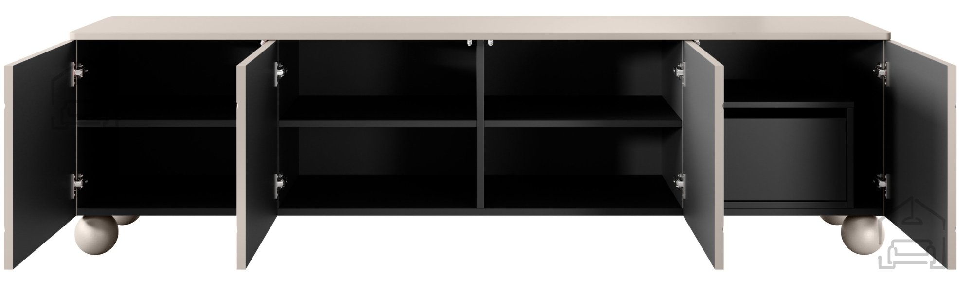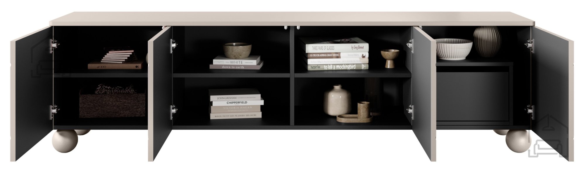 Stilvolles Design Der Kaschmir-Farbton verleiht der Kommode einen edlen Charakter, der sich wunderbar mit verschiedensten Einrichtungsstilen – von modern bis klassisch – kombinieren lässt. Schwarze Akzente an Sockel, Regalböden und mittleren Elementen sorgen für Kontrast und Tiefe, während die sorgfältig gearbeiteten ABS-Kanten das Gesamtbild abrunden.
