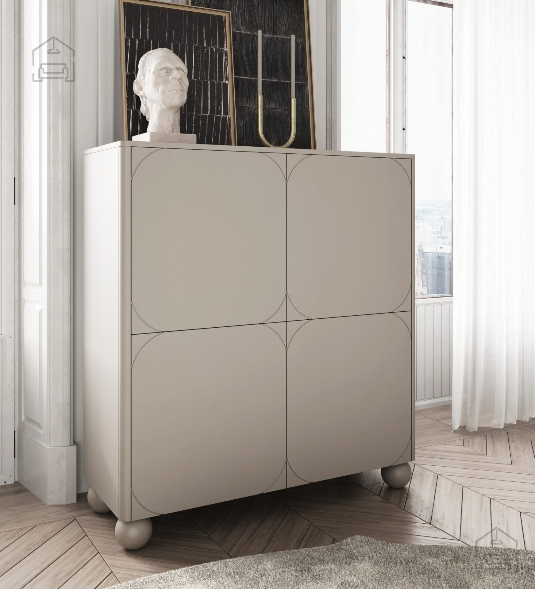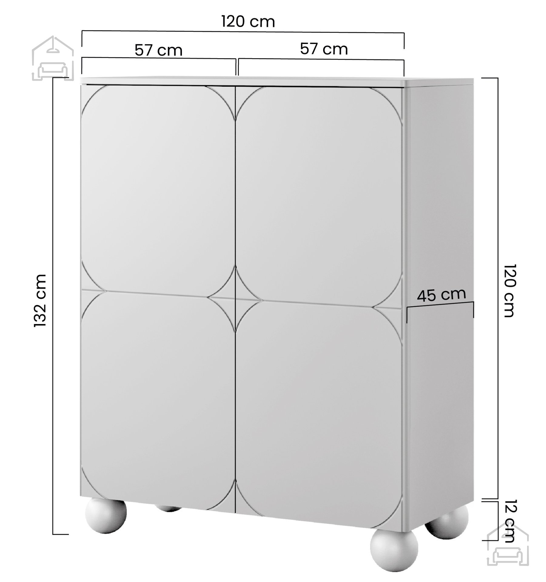 Füße: Die Kommode steht auf eleganten, runden Holzfüßen mit einer Höhe von 12 cm – das wirkt modern und erleichtert zugleich die Bodenreinigung.