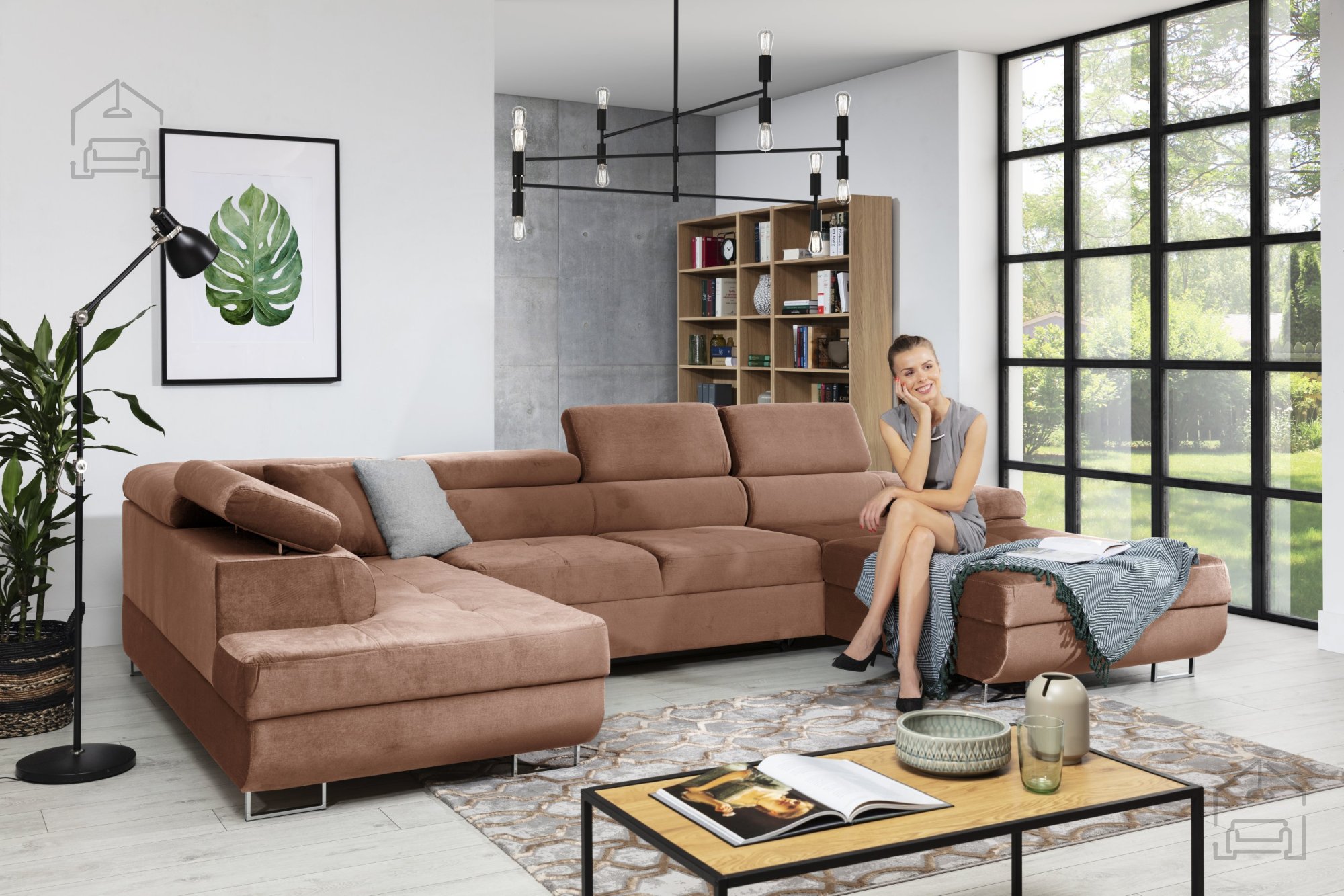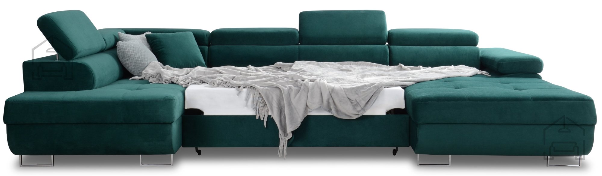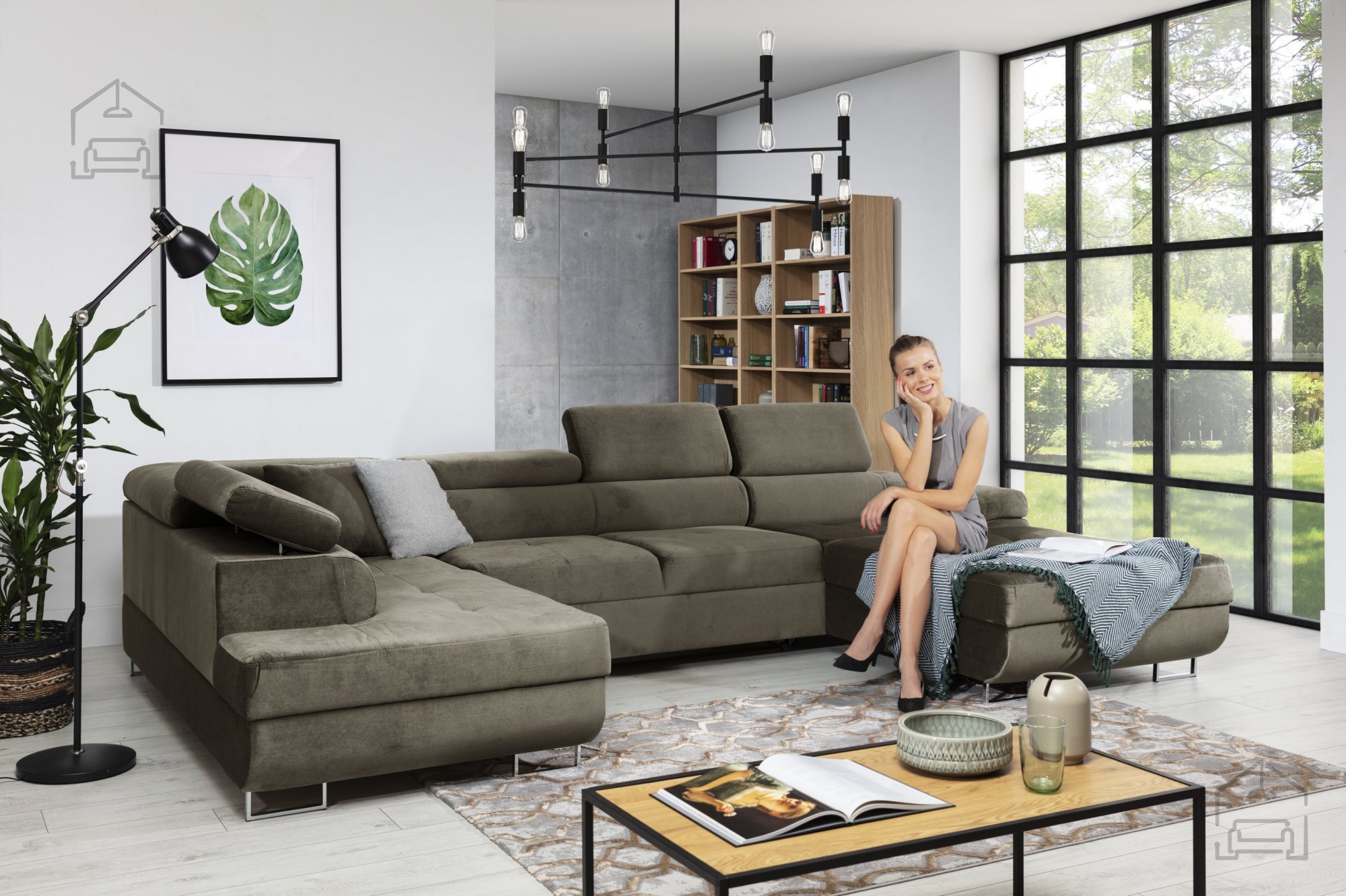Mit dem innovativen Dolphin-Mechanismus lässt sich die Wohnlandschaft einfach und schnell in ein geräumiges Bett verwandeln. Die Liegefläche von 266x124 cm bietet ausreichend Platz für eine bequeme Übernachtung von Gästen oder zum Entspannen an einem gemütlichen Nachmittag. Verstellbare Kopfstützen ermöglichen eine individuelle Anpassung des Sitzes an Ihre persönlichen Bedürfnisse und erhöhen so zusätzlich den Komfort.