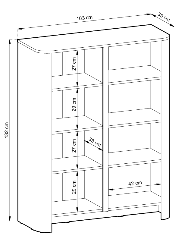 Maße: 103x39x132 cm – die Kommode Bari K103 ist sorgfältig konzipiert, um sich harmonisch in verschiedene Wohnbereiche einzufügen, egal ob im Wohnzimmer, Schlafzimmer oder Vorraum. Dank ihrer ausgewogenen Maße bietet sie großzügigen Stauraum, ohne dabei zu viel Platz zu beanspruchen.