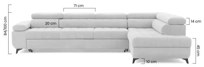 Das Ecksofa Dragonis Maxi ist nicht nur ein Möbelstück, sondern ein funktionales Element Ihres Zuhauses. Die Bettkastenlade ist diskret eingebaut und ermöglicht die Aufbewahrung zusätzlicher Decken oder Kissen, was besonders in kleineren Räumen praktisch ist.