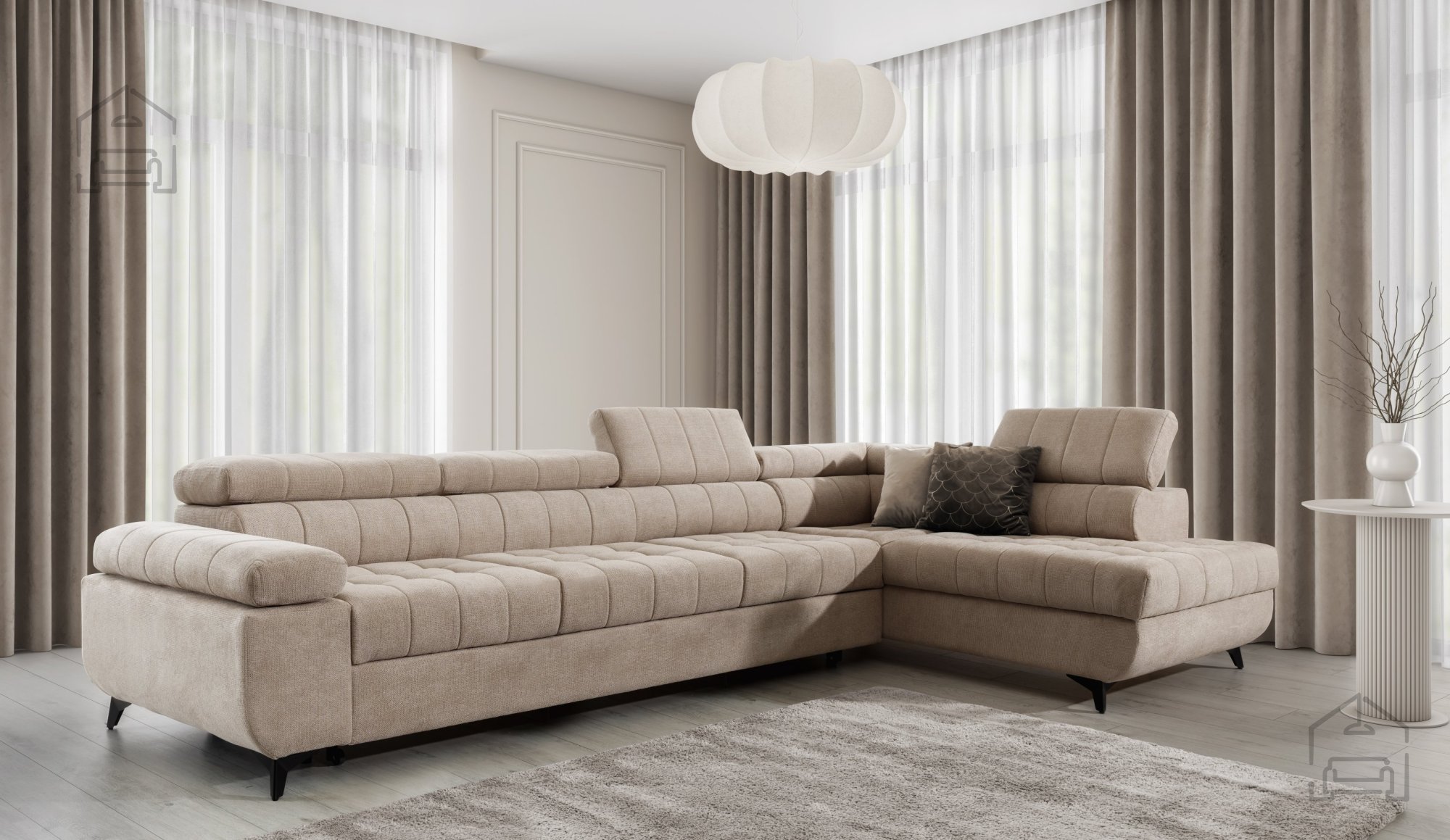Treten Sie ein in die Welt des Komforts und der Eleganz mit dem Ecksofa Dragonis Maxi, der perfekten Wahl für jedes moderne Zuhause. Mit seinen beeindruckenden Abmessungen von 338x203x100 cm und dem raffinierten Design wird dieses Sofa nicht nur das zentrale Stück Ihres Wohnzimmers sein, sondern auch der Ort, an dem Sie sich gerne entspannen und wertvolle Zeit mit Ihrer Familie und Ihren Freunden genießen werden.