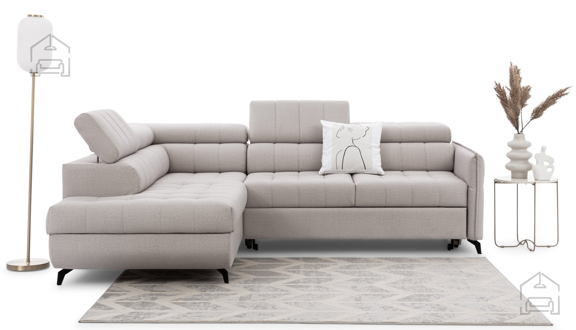 Eines der Hauptmerkmale des Ecksofas Elarias L ist sein fortschrittlicher Dolphin-Mechanismus, der eine schnelle und einfache Umwandlung in ein bequemes Bett mit einer Liegefläche von 194x124 cm ermöglicht. Diese Funktion ist ideal für Gäste, die über Nacht bleiben, oder für jene entspannenden Momente, wenn Sie den Wohnraum in einen Ruhebereich verwandeln möchten.