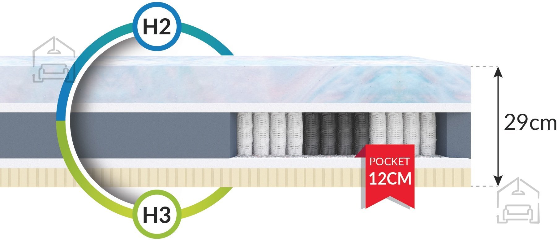Das Herzstück dieses Modells ist ein Taschenfederkern, der aus zahlreichen einzeln in Stofftaschen eingenähten Federn besteht. Jede Feder reagiert unabhängig, was den Liegekomfort deutlich erhöht. So spürt die zweite Person kaum, wenn sich der Partner im Schlaf bewegt oder umdreht. Die Federn werden mit der NanoHARD-Technologie hergestellt, was ihre Lebensdauer erheblich verlängert. Die Matratze LUMINO ist in 7 Zonen mit unterschiedlicher Härte unterteilt, damit jeder Körperbereich optimal entsprechend seinem Gewicht gestützt wird.