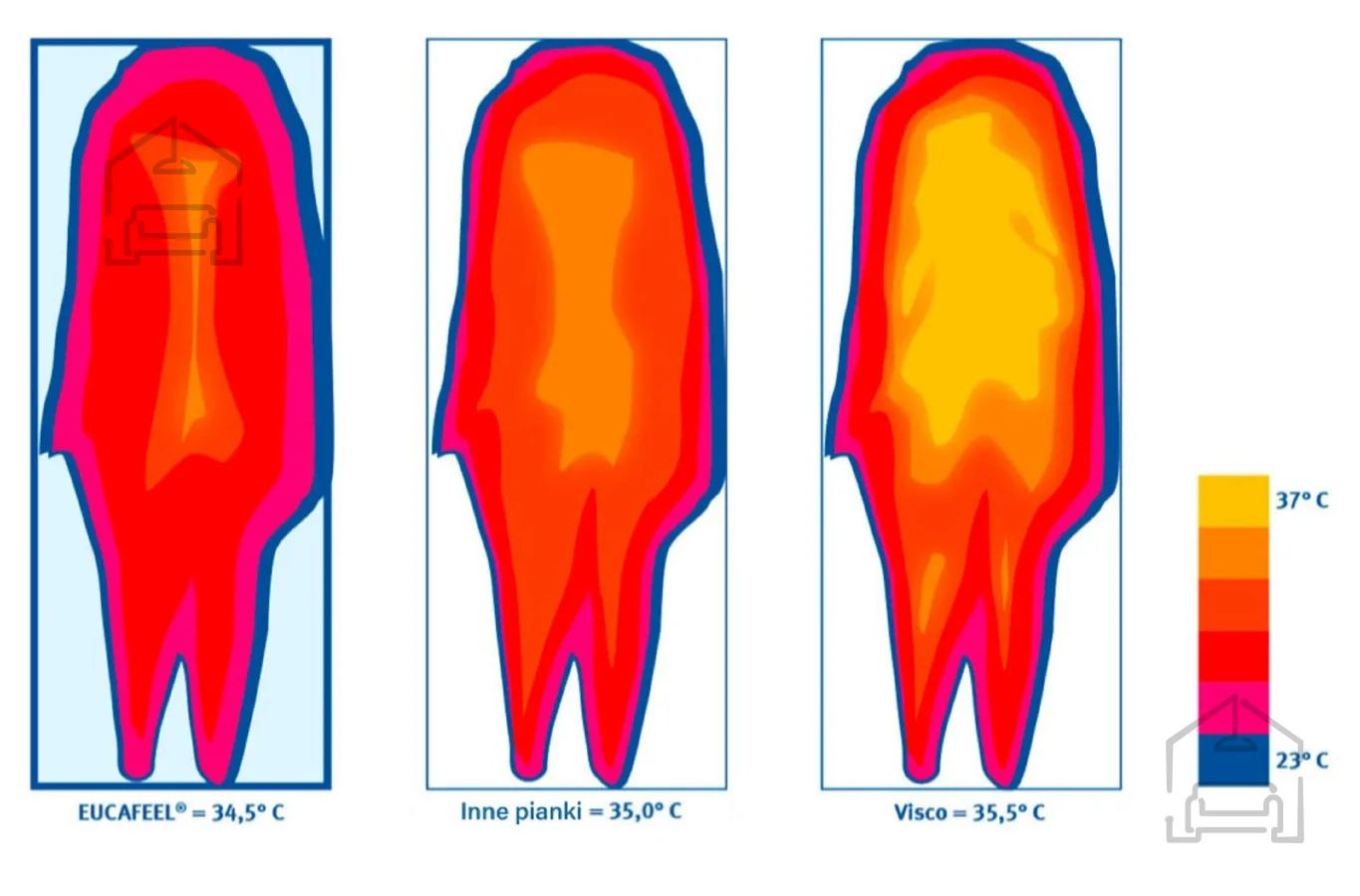 EUCAFEEL leitet Körperwärme während des Schlafs effizient ab und sorgt für ein angenehmes, ausgeglichenes Schlafumfeld. Studien zeigen eine deutlich geringere Wärmeaufnahme und eine gleichmäßigere Temperaturverteilung als bei anderen Schäumen oder viskoelastischen Materialien.