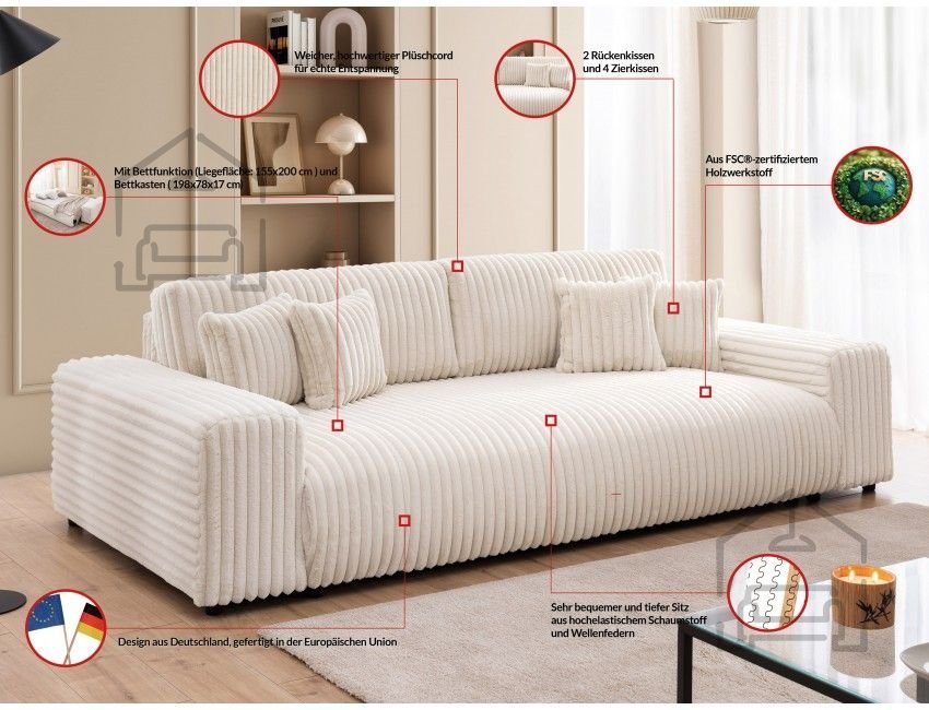 Trosed Justin se ponaša z ležalno površino velikosti 200x155 cm, ki omogoča udobno spanje ali sproščanje. Zahvaljujoč integriranemu predalu za posteljnino lahko enostavno shranjujete dodatne odeje ali blazine, kar povečuje funkcionalnost vašega dnevnega prostora.
