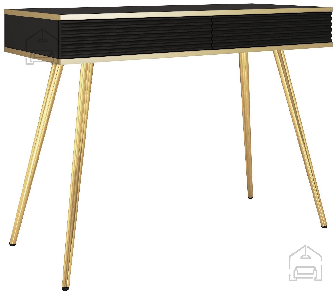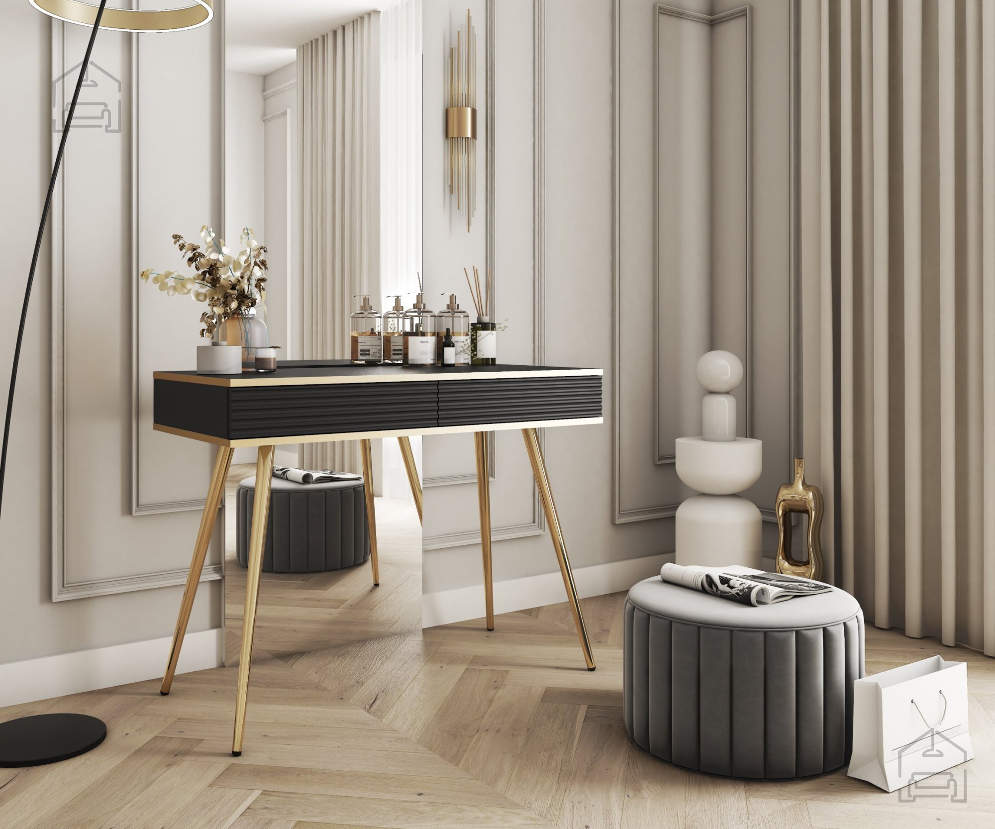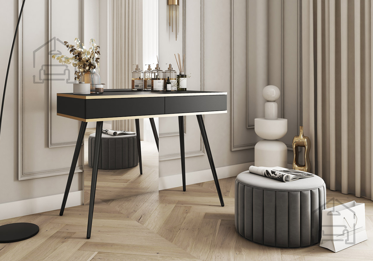 Entdecken Sie die Schönheit und praktische Seite des Schminktisches Oro, der mit seinem eleganten schwarzen Farbton und dem hochwertigen Design all Ihre Wünsche erfüllt. Gefertigt aus erstklassigem MDF-Material vereint dieser Tisch Langlebigkeit und ansprechende Optik – ideal für jedes moderne Zuhause.