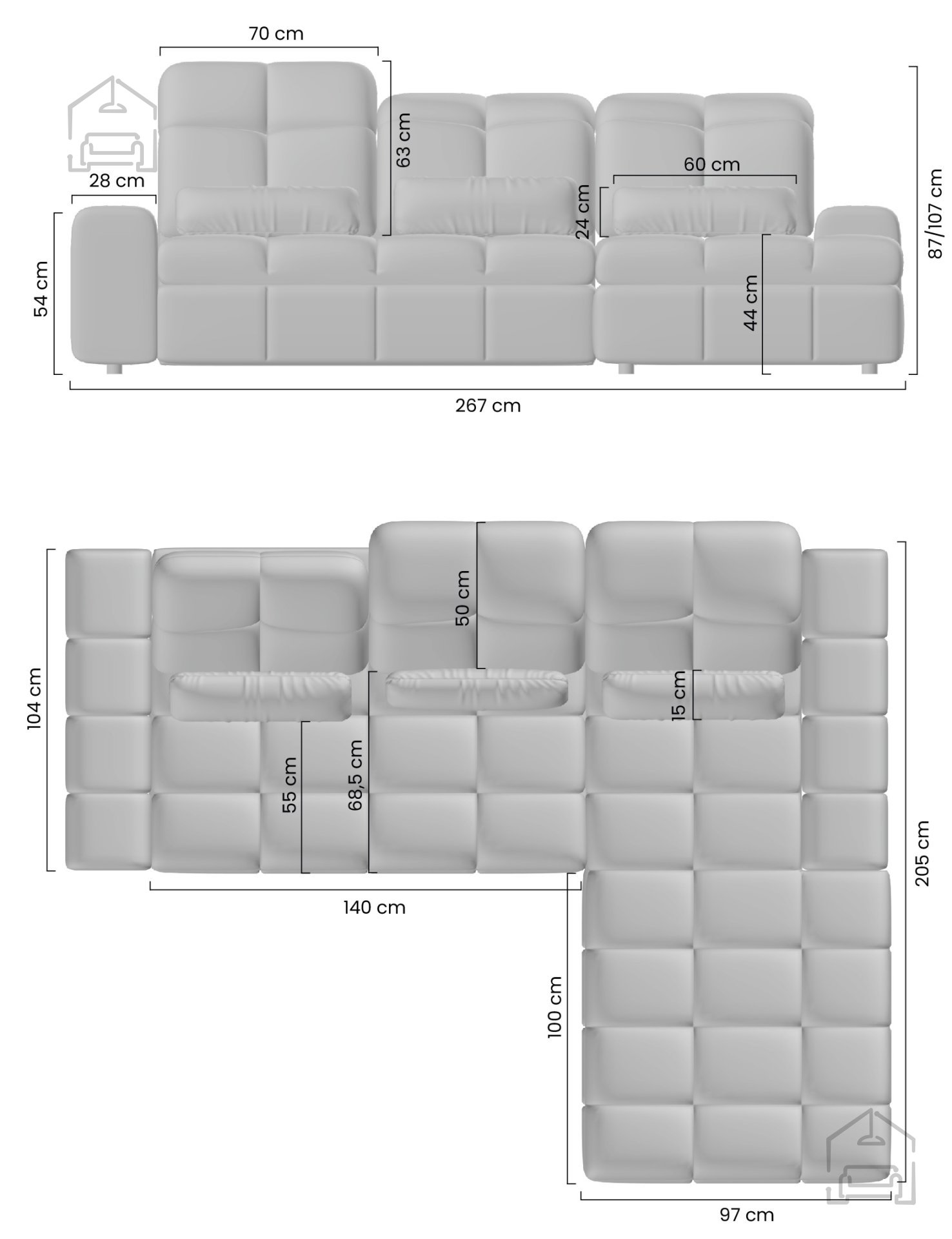 Wenn Sie ein Sofa suchen, das Eleganz, Komfort und Praktikabilität vereint, ist das Ecksofa Magnelio Mini die richtige Wahl für Sie. Mit seinen durchdachten Maßen von 267x205x107 cm passt es mühelos in jeden Raum und wird zum Mittelpunkt Ihres Wohnzimmers.