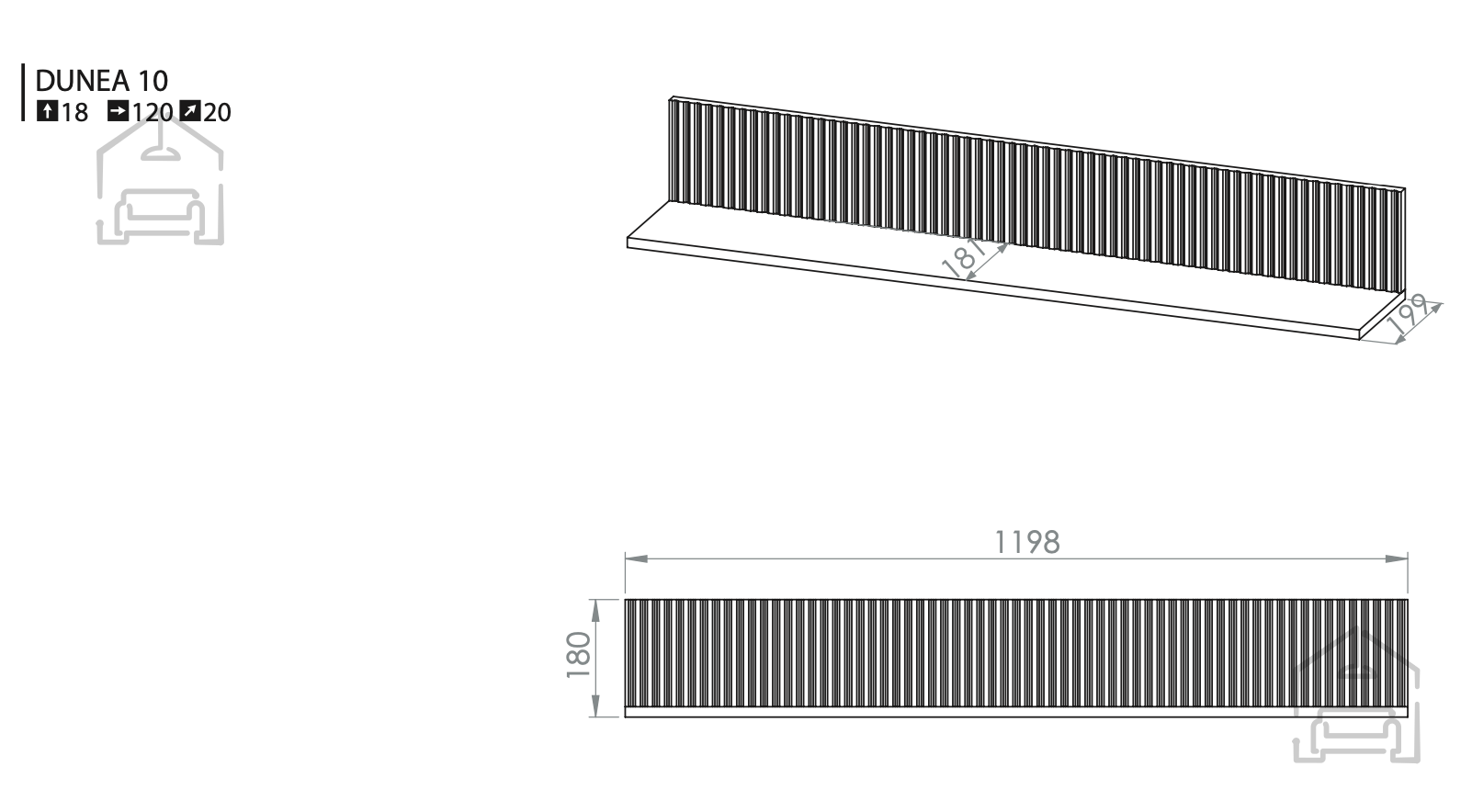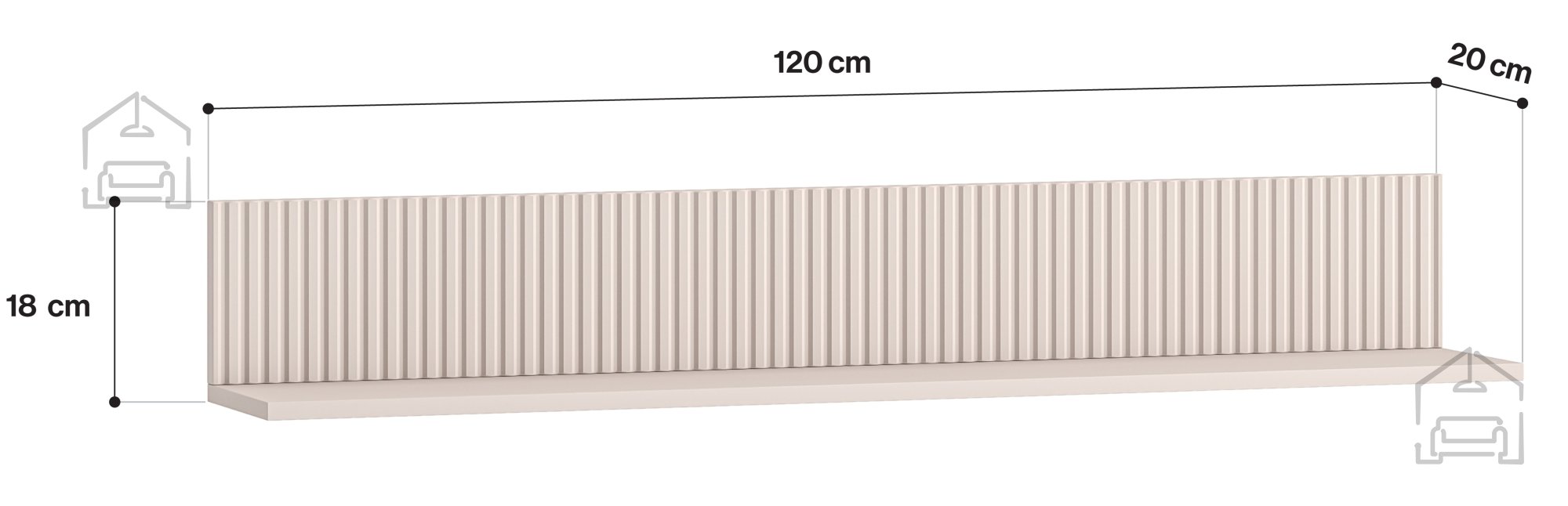 Das Wandregal Dunea ist die perfekte Kombination aus Ästhetik und Funktionalität, die jeden Raum in Ihrem Zuhause bereichern wird. Mit den Maßen 120x20x18 cm fügt es sich elegant in alle Arten von Interieurs ein, von modern bis klassisch. Es ist aus hochwertigen Materialien wie MDF und laminierter Spanplatte gefertigt, was Langlebigkeit und Widerstandsfähigkeit gegen den täglichen Gebrauch gewährleistet.
