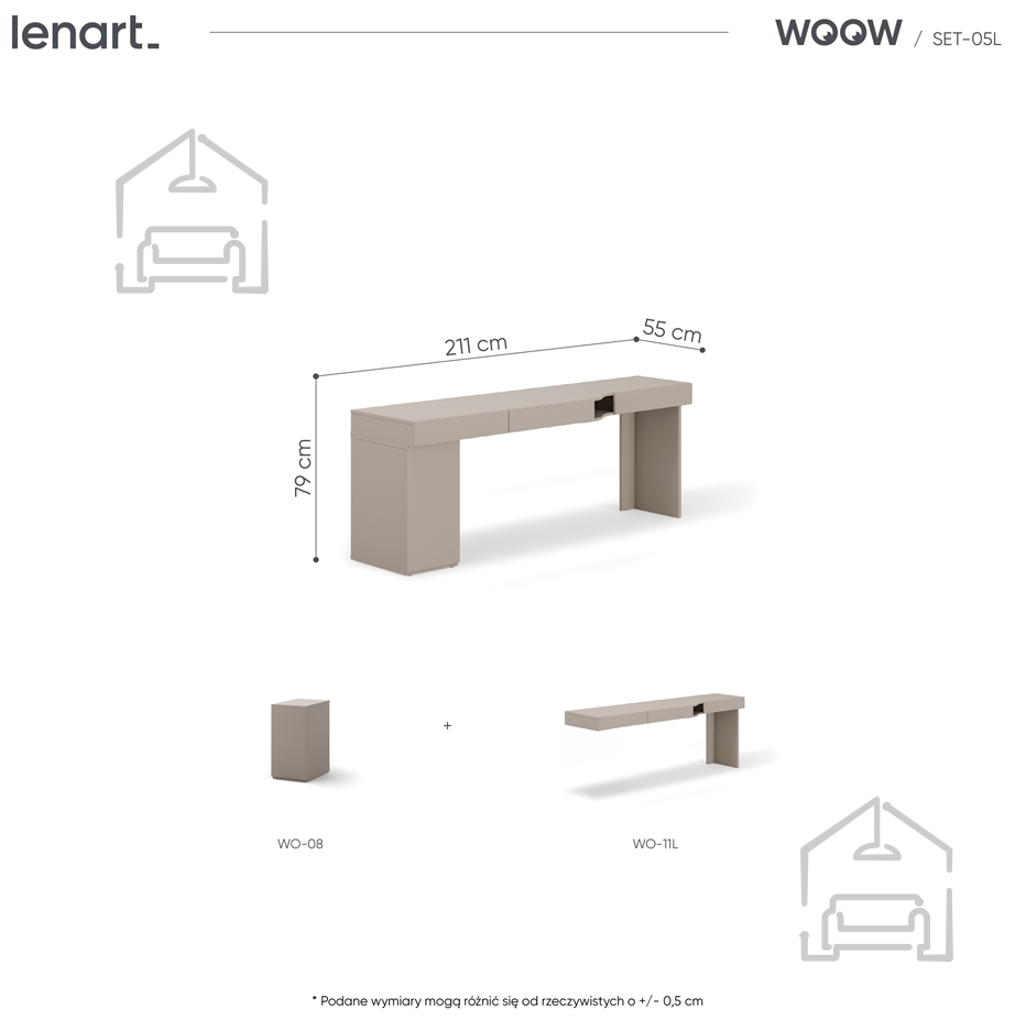 Das Set Woow - SET-05L zeichnet sich durch seine moderne Farbkombination aus: Champagner, gebleichte Vincenza-Eiche und Ton-Grau. Dieses Farbschema fügt sich leicht in jeden Raum ein und verleiht ihm einen Hauch von Eleganz und Modernität. Es ist aus hochwertiger, laminierter Spanplatte mit einer Stärke von 16 mm und 22 mm gefertigt, was Langlebigkeit und eine lange Lebensdauer gewährleistet. Die Kanten sind mit ABS-Band verarbeitet, was zusätzlich zur Haltbarkeit und zum ästhetischen Erscheinungsbild beiträgt.