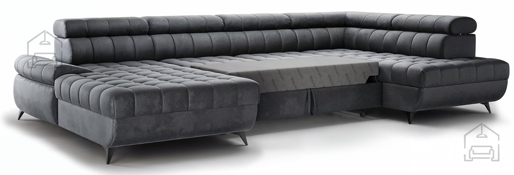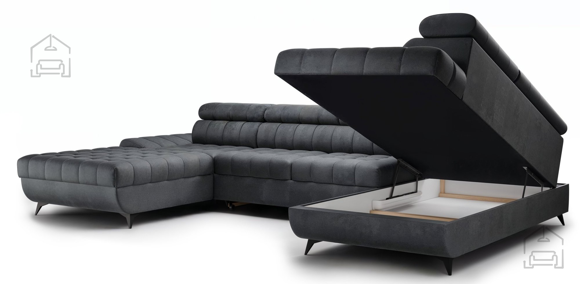 Die Liegefläche misst 263x124 cm, was zusätzliche Funktionalität bietet. Mit dem Dolphin-Mechanismus lässt sich die Wohnlandschaft leicht in ein bequemes Bett verwandeln, was sie auch ideal für übernachtende Gäste macht. Die Wohnlandschaft verfügt zudem über eine praktische Bettzeugschublade, die zusätzlichen Stauraum bietet und Ihr Zuhause ordentlich hält.