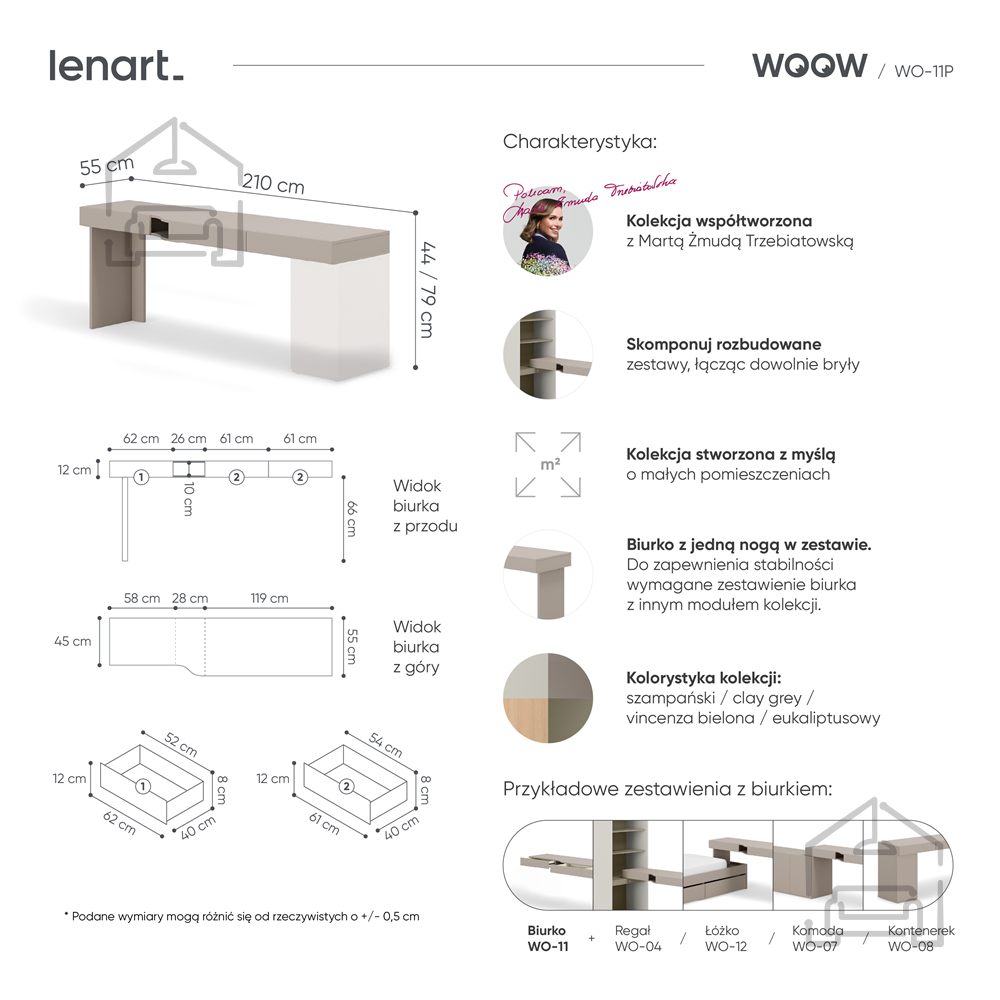 Der Schreibtisch WO-11 ist nicht nur ein funktionales Möbelstück, sondern auch ein Ausdruck von Stil. Seine hochwertige Verarbeitung gewährleistet eine lange Lebensdauer, während sein modernes Erscheinungsbild die Ästhetik Ihres Zuhauses oder Büros verbessert. Außerdem wird er in der renommierten Fabrik in Sankt Leonhard in Polen hergestellt, was hohe Produktionsstandards und die Verwendung erstklassiger Materialien garantiert.