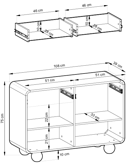 Mit den Maßen 108x39x75 cm bietet die Kommode Albion 108 großzügigen Stauraum. Die breiten Schubladen und Ablageflächen erleichtern die Organisation und tragen zu einem aufgeräumten, ordentlichen Wohnambiente bei.