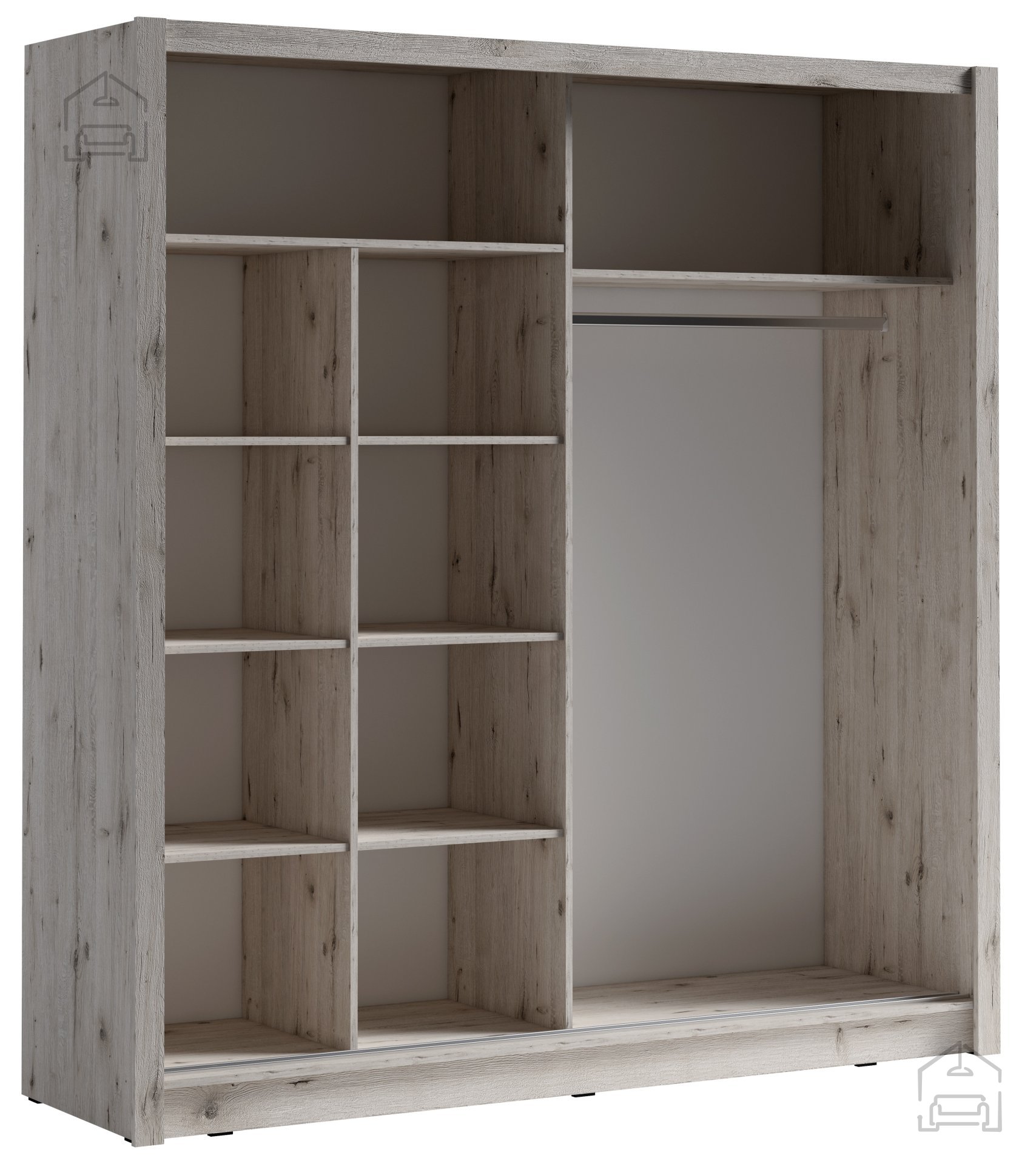 Geräumig und praktisch: Mit seinen beeindruckenden Abmessungen bietet der Schrank genügend Platz zur Aufbewahrung all Ihrer Kleidung und Accessoires. Die Schiebetüren ermöglichen einen einfachen Zugang und sparen Platz, was besonders in kleineren Wohnungen wichtig ist.