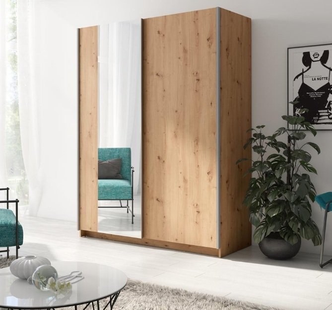 Der Schrank mit Schiebetüren und integriertem Spiegel ist die ideale Lösung für alle, die Platz sparen möchten, ohne auf Komfort und Funktionalität zu verzichten. Die Schiebetüren ermöglichen ein einfaches Öffnen auch in kleineren Räumen, während der Spiegel an der Vorderseite den Raum optisch vergrößert und dafür sorgt, dass Sie sich vor dem Verlassen des Hauses schnell zurechtmachen können. Die Maße 150x62x198 cm sind durchdacht gestaltet, um genügend Platz für Kleidung, Schuhe und Modeaccessoires zu bieten, ohne zu viel Bodenfläche einzunehmen.