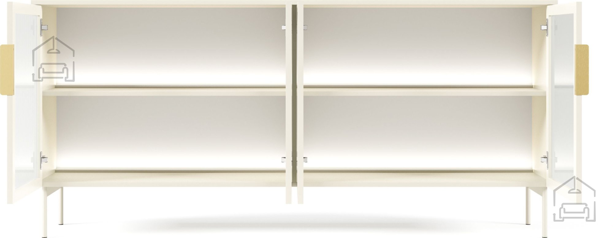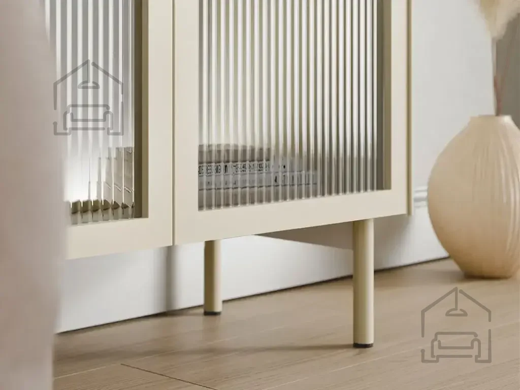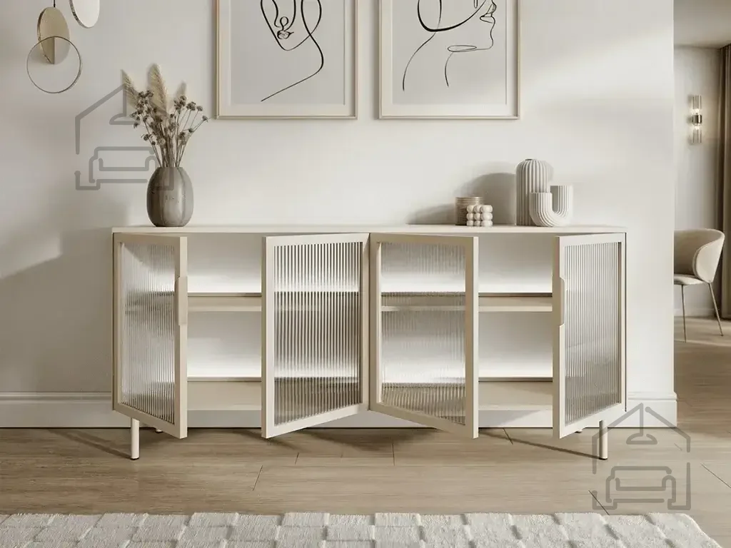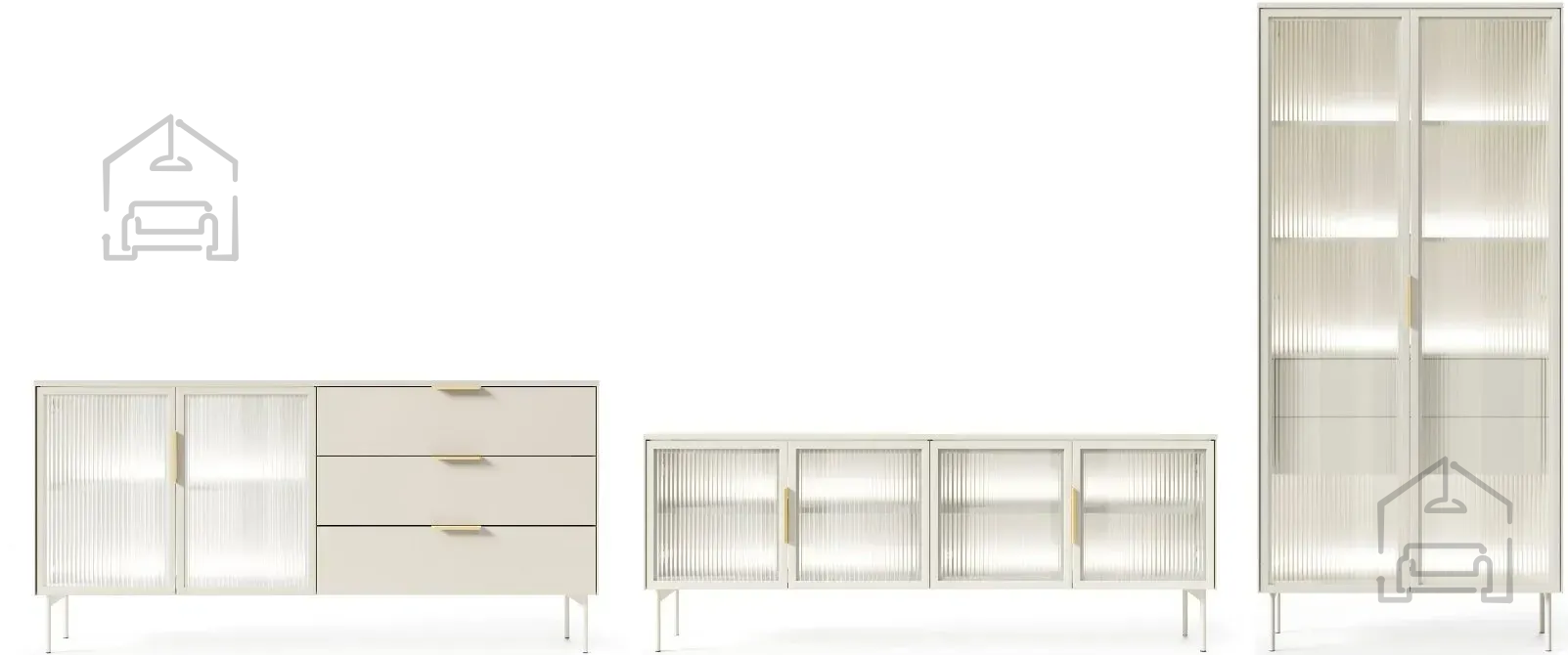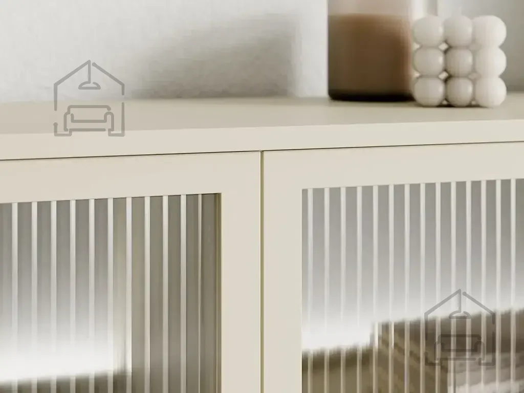 Der Korpus der Kommode besteht aus laminierter Spanplatte E05 mit einer Stärke von 16 mm, die hervorragende Festigkeit und eine lange Lebensdauer gewährleistet. Die Seiten sind mit MDF-Leisten verziert, deren Struktur ein interessantes Spiel von Licht und Schatten erzeugt. Die Fronten sind mit einem MDF-Rahmen mit gehärteten Rillen und dekorativem Glas veredelt, was dem Stück ein luxuriöses Aussehen verleiht. Alle Flächen sind mit ABS-Kanten in der Farbe der Platte versehen, was die Stoß- und Verschleißfestigkeit erhöht.