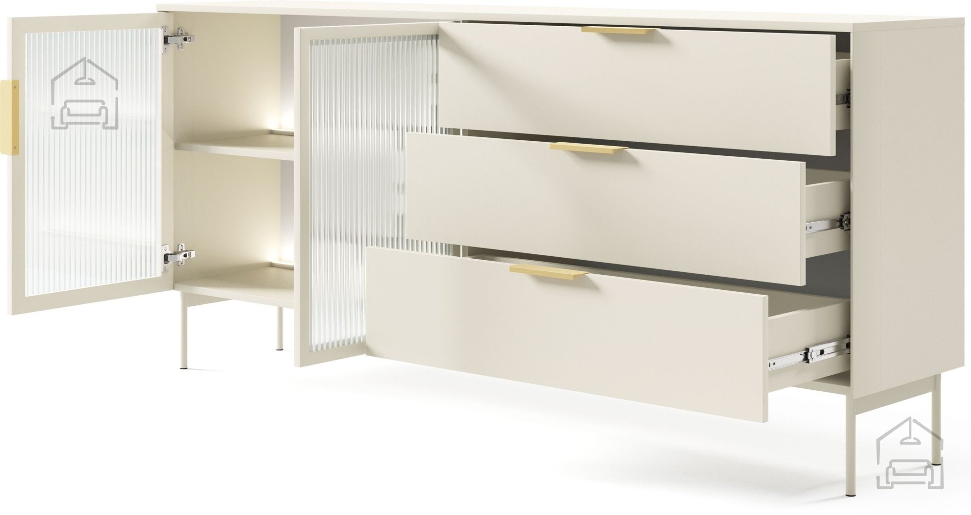 Die Kommode ist mit zuverlässigen Doppelscharnieren und Kugelführungen mit Vollauszug ausgestattet, die ein sanftes und leises Öffnen der Türen und Schubladen ermöglichen. Das Innere verbirgt geräumige Regale und Schubladen, in denen Sie Geschirr, Textilien, Dokumente oder persönliche Gegenstände aufbewahren können. Die Schubladen bestehen aus weißer HDF-Platte, die leicht zu reinigen und zu pflegen ist.