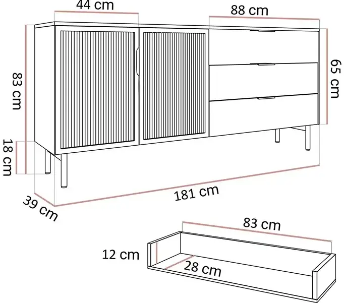 Der Korpus der Kommode besteht aus laminierter Spanplatte E05 mit einer Stärke von 16 mm, die hervorragende Stabilität und eine lange Lebensdauer gewährleistet. Die Seiten sind mit MDF-Leisten verziert, deren Struktur ein interessantes Spiel von Licht und Schatten erzeugt. Die Fronten sind mit einem MDF-Rahmen mit gehärteten Rillen und dekorativem Glas veredelt, was dem Stück ein luxuriöses Aussehen verleiht. Alle Oberflächen sind mit ABS-Kanten in der Farbe der Platte versehen, was die Schlag- und Verschleißfestigkeit erhöht.