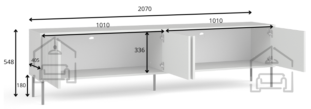 Die Abmessungen von 207x41x54,8 cm bieten reichlich Stauraum. Vier geräumige Türen verbergen Innenregale, auf denen Sie elektronische Geräte, Multimediazubehör, Bücher oder andere Gegenstände ordentlich aufbewahren können. Die obere Fläche der Kommode ist ideal für die Platzierung eines Fernsehers, von Dekorationen oder Familienfotos.