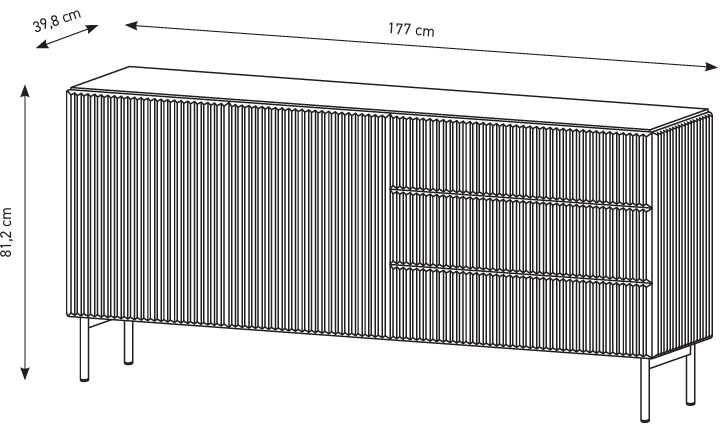 Mit den Maßen 177 x 39,8 x 81,2 cm bietet sie viel Stauraum, den Sie an Ihre Bedürfnisse anpassen können. Im Inneren befinden sich geräumige Schubladen mit Kugelführungsschienen und Vollauszug, was bedeutet, dass Sie immer den vollständigen Überblick über den Inhalt haben. Doppelscharniere an den Türen gewährleisten ein reibungsloses und leises Öffnen und Schließen.