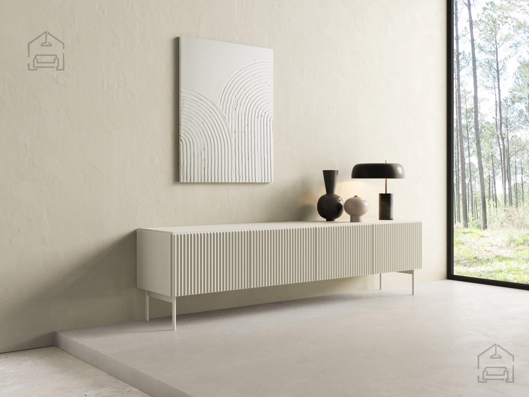 Die sanfte, aber ausdrucksstarke Farbe Kaschmir in Kombination mit der gefrästen MDF-Platte an der Vorderseite schafft ein Gefühl von Wärme und Prestige. Das zeitlose Design ermöglicht eine einfache Kombination mit verschiedenen Einrichtungsstilen – von minimalistisch über skandinavisch bis hin zu industriell. Die Metallbeine in derselben Farbe verleihen Stabilität und visuelle Leichtigkeit und ermöglichen gleichzeitig eine einfachere Reinigung des Bodens unter der Kommode.