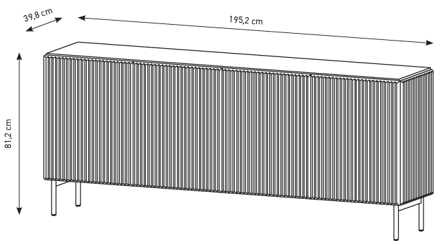 Die Kommode misst 195,2 x 39,8 x 81,2 cm, was viel Stauraum bietet, ohne zu viel Platz im Raum einzunehmen. Sie besteht aus hochwertiger gefräster MDF-Platte mit einer Stärke von 18 mm und laminierter Spanplatte mit einer Stärke von 16 mm, was eine lange Lebensdauer und Stabilität der Konstruktion gewährleistet. Die Front aus gefräster MDF-Platte verleiht dem Möbelstück ein modernes, dreidimensionales Aussehen, während die ABS-Kante in der Farbe der Platte die Ränder vor Abnutzung und Beschädigung schützt.