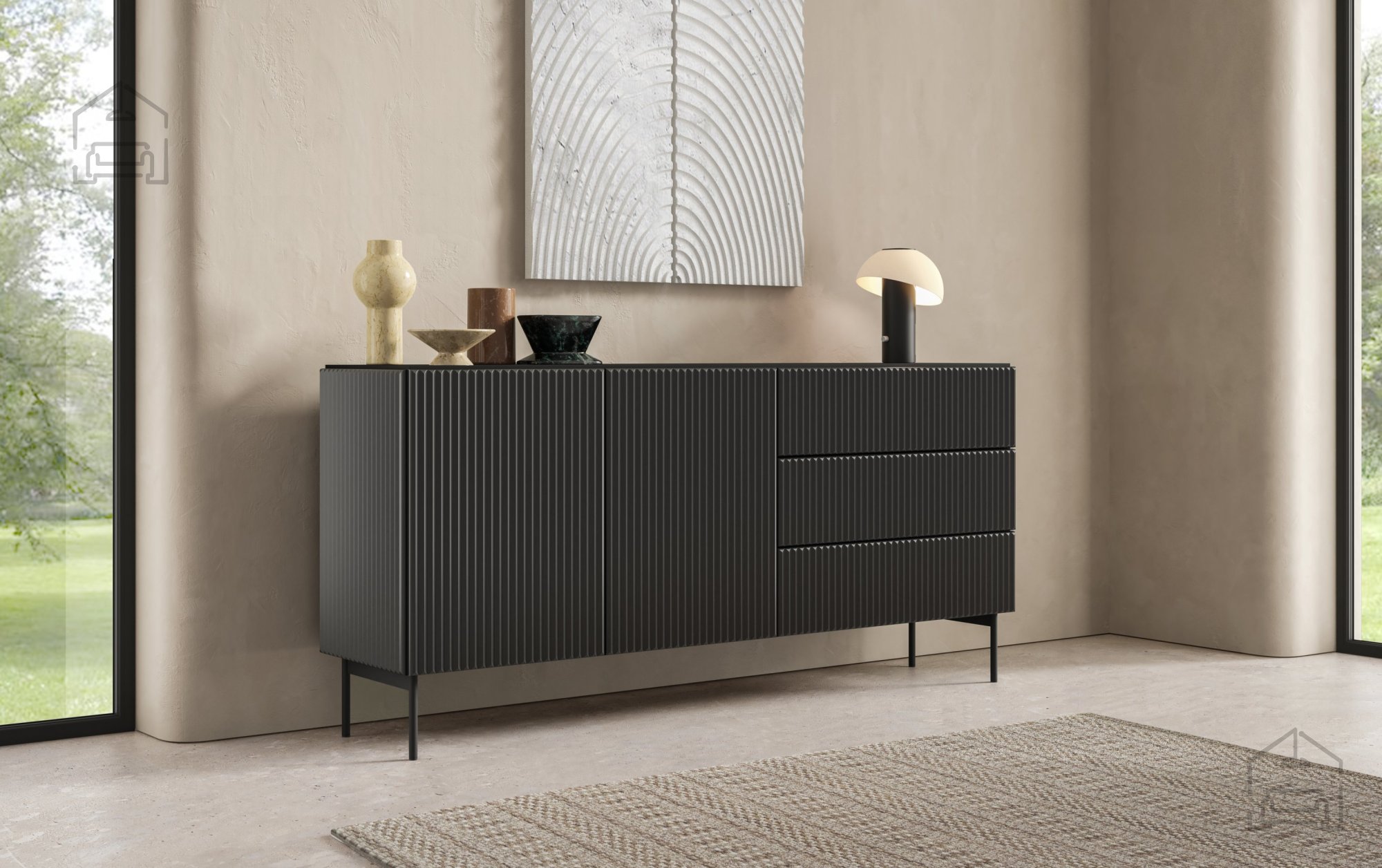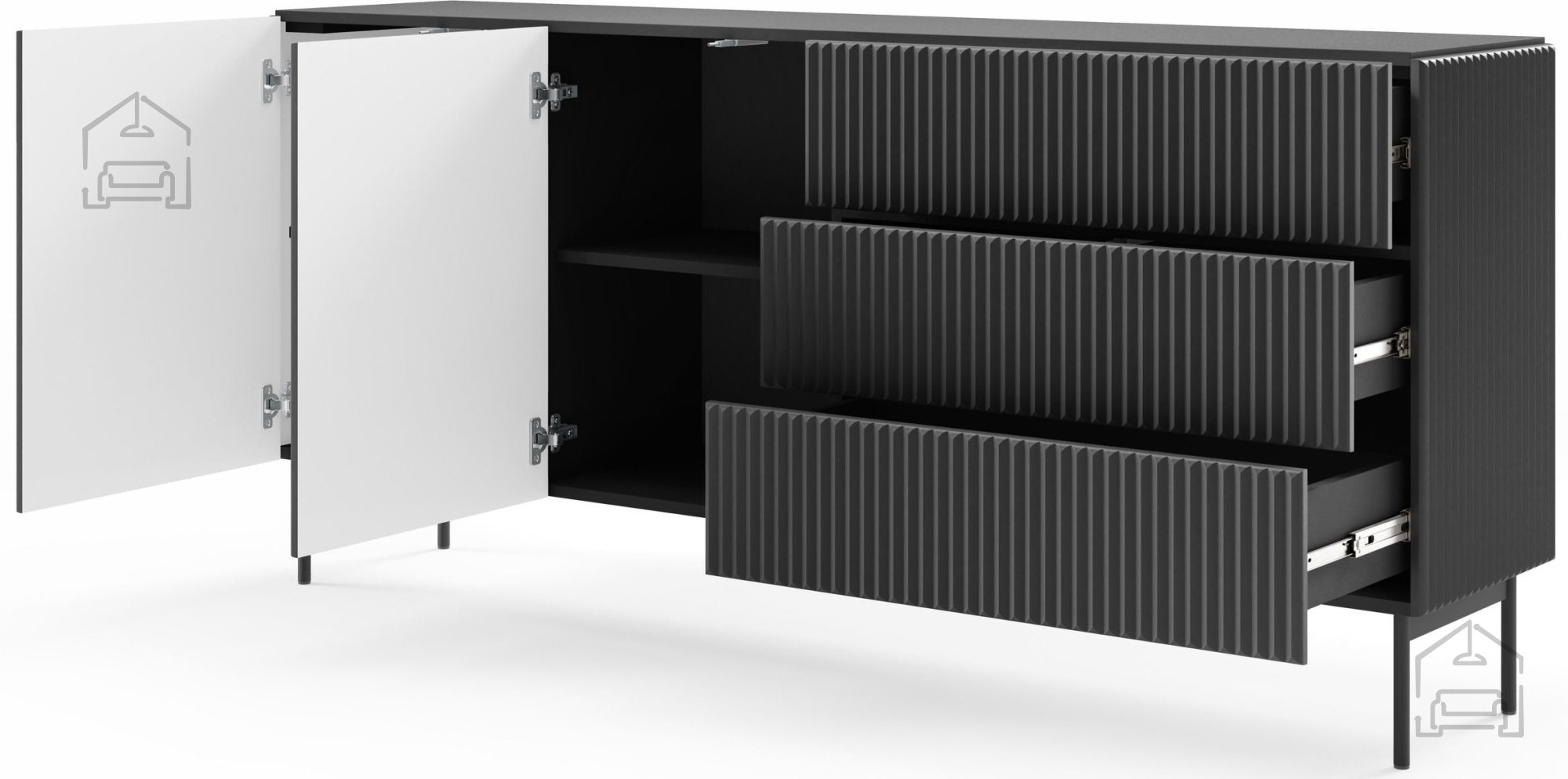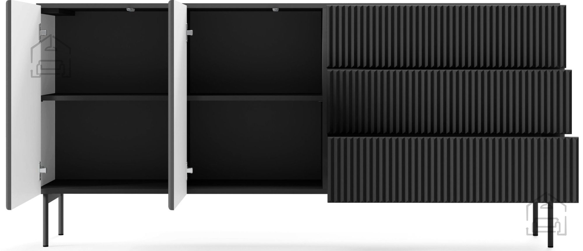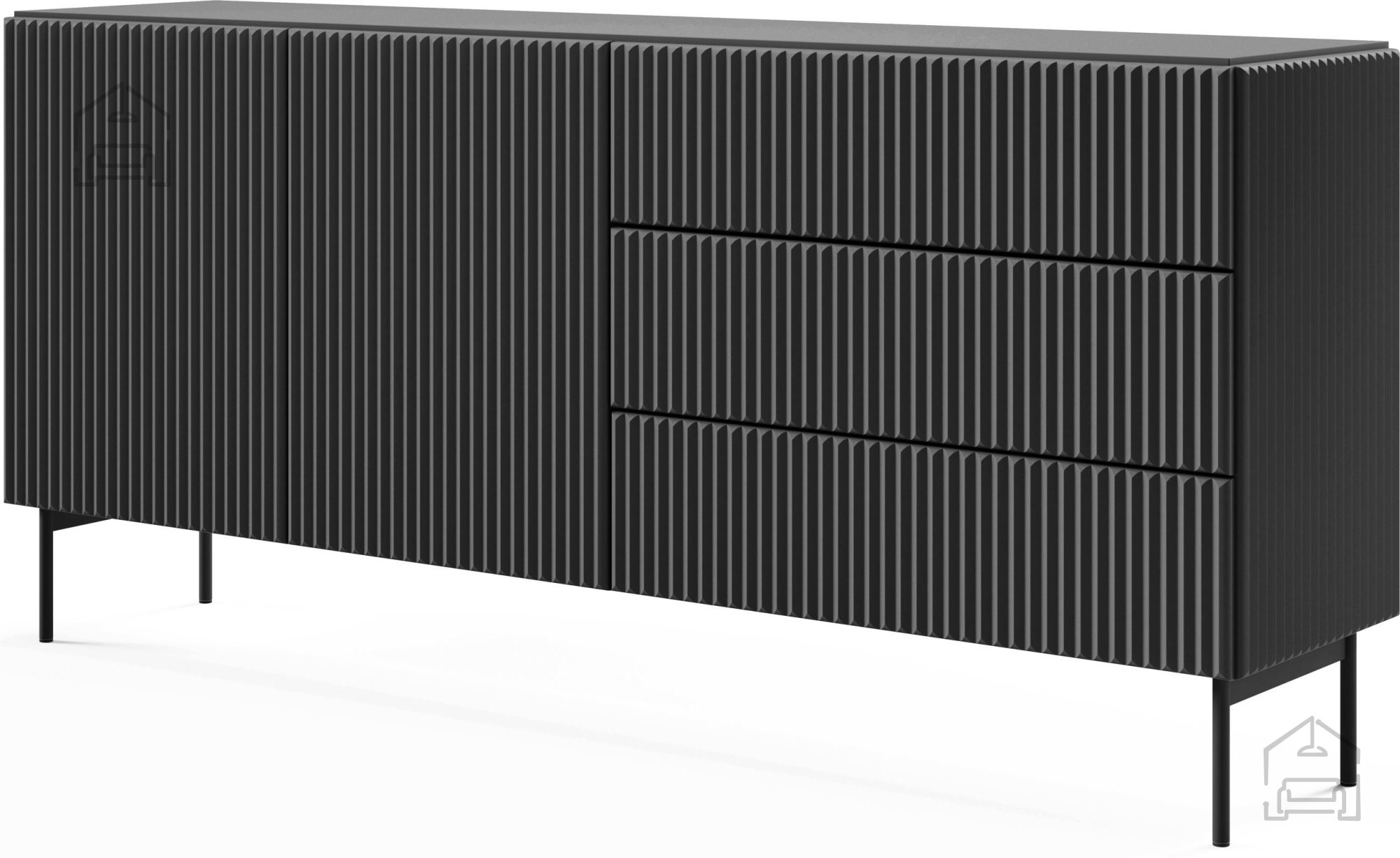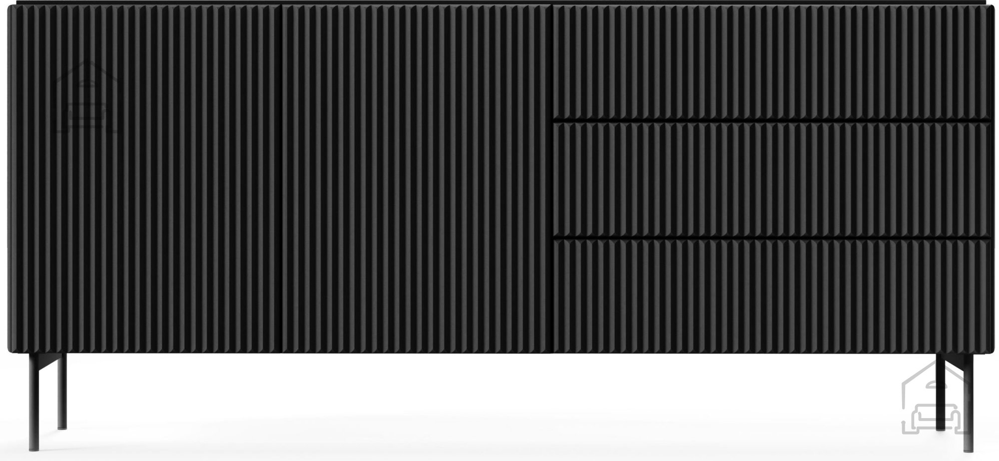 Die Kombination aus tiefem Schwarz und subtilen Rillen auf den Fronten schafft ein äußerst edles Erscheinungsbild, das sowohl zu modernen als auch zu klassischen Räumen passt. Dank der ABS-Kante in Plattenfarbe sind die Kanten zusätzlich vor Stößen und Abnutzung geschützt, wodurch das makellose Aussehen über viele Jahre erhalten bleibt. Die schwarze Farbe harmoniert hervorragend mit verschiedenen Materialien und Farbkombinationen, sodass die Kommode eine einfache Abstimmung mit vorhandenen Möbeln und Dekorationen ermöglicht.