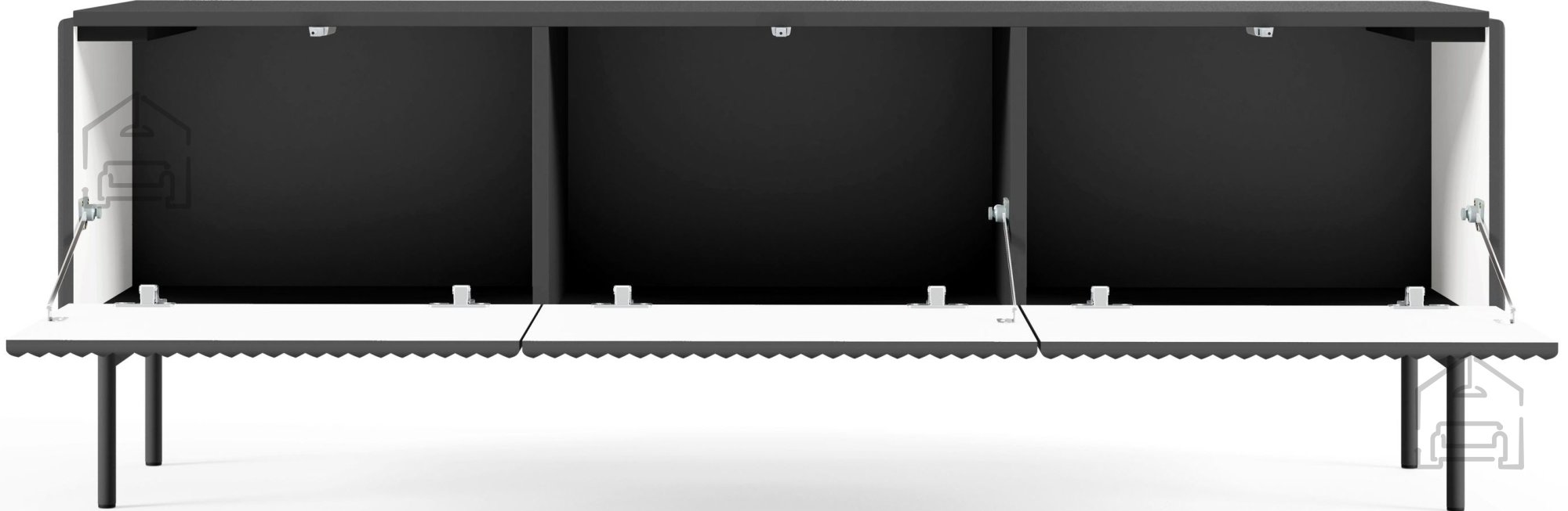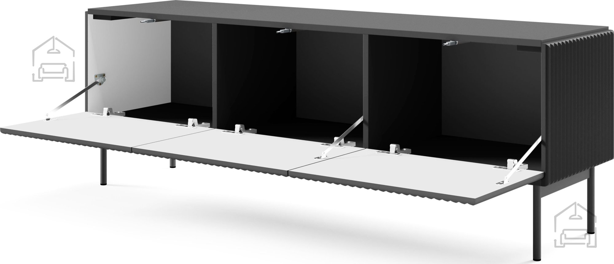 Die Kombination aus gefräster MDF-Platte mit einer Stärke von 18 mm und laminierter Spanplatte gewährleistet Festigkeit und Langlebigkeit, während die schwarze matte Oberfläche einen Hauch von Luxus und Modernität einbringt. Die Front ist grifflos gestaltet – Schubladen und Türen öffnen sich durch einfaches Drücken eines Knopfes, was ein klares und zeitloses Erscheinungsbild schafft. Schwarze Metallbeine sorgen für Stabilität und optische Leichtigkeit, wodurch sich die Kommode sowohl in kleine als auch in größere Räume harmonisch einfügt.