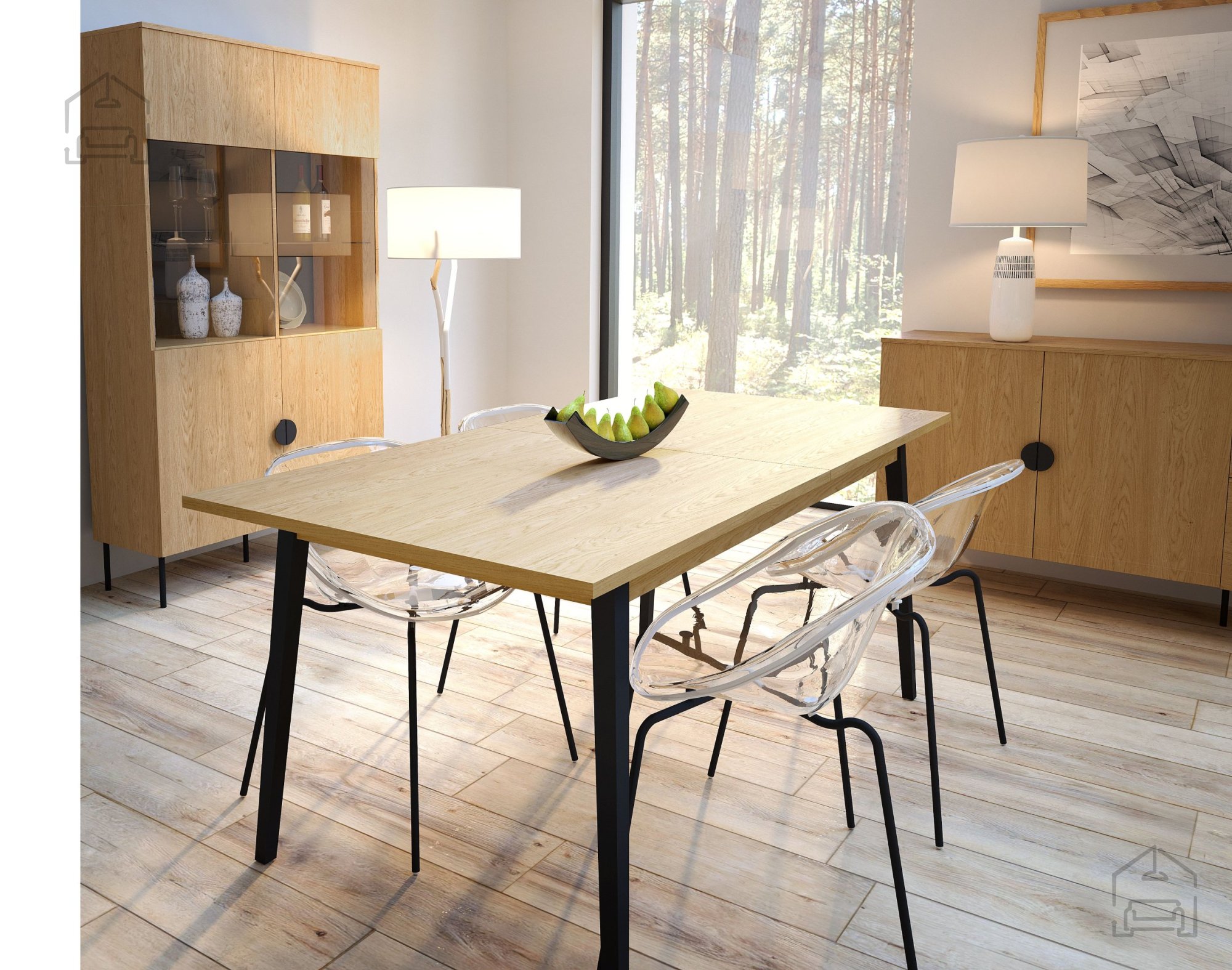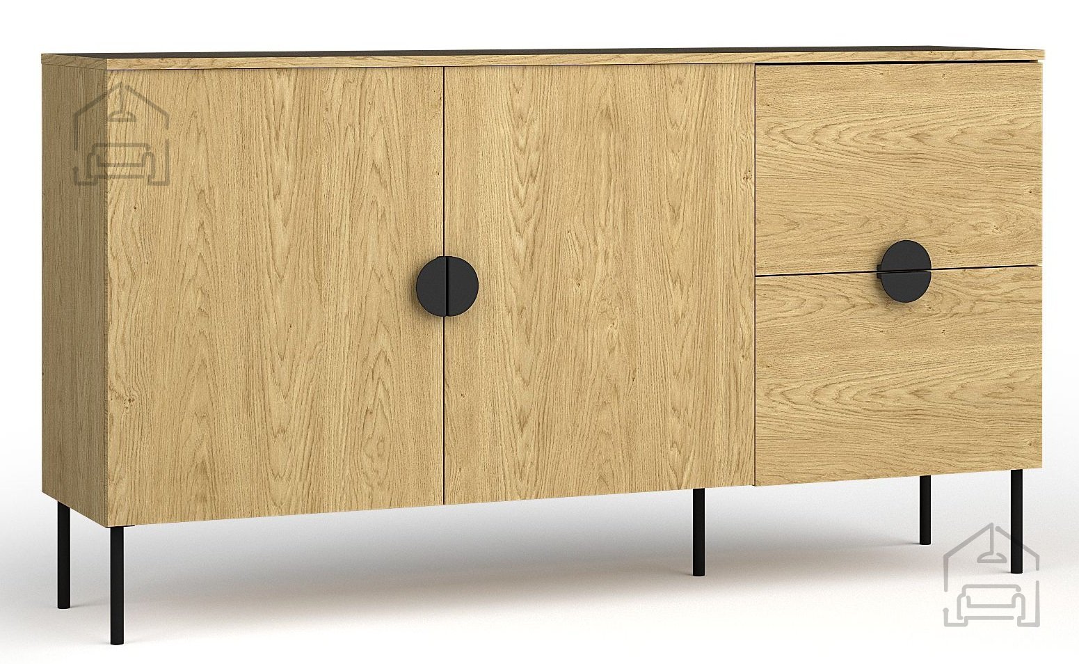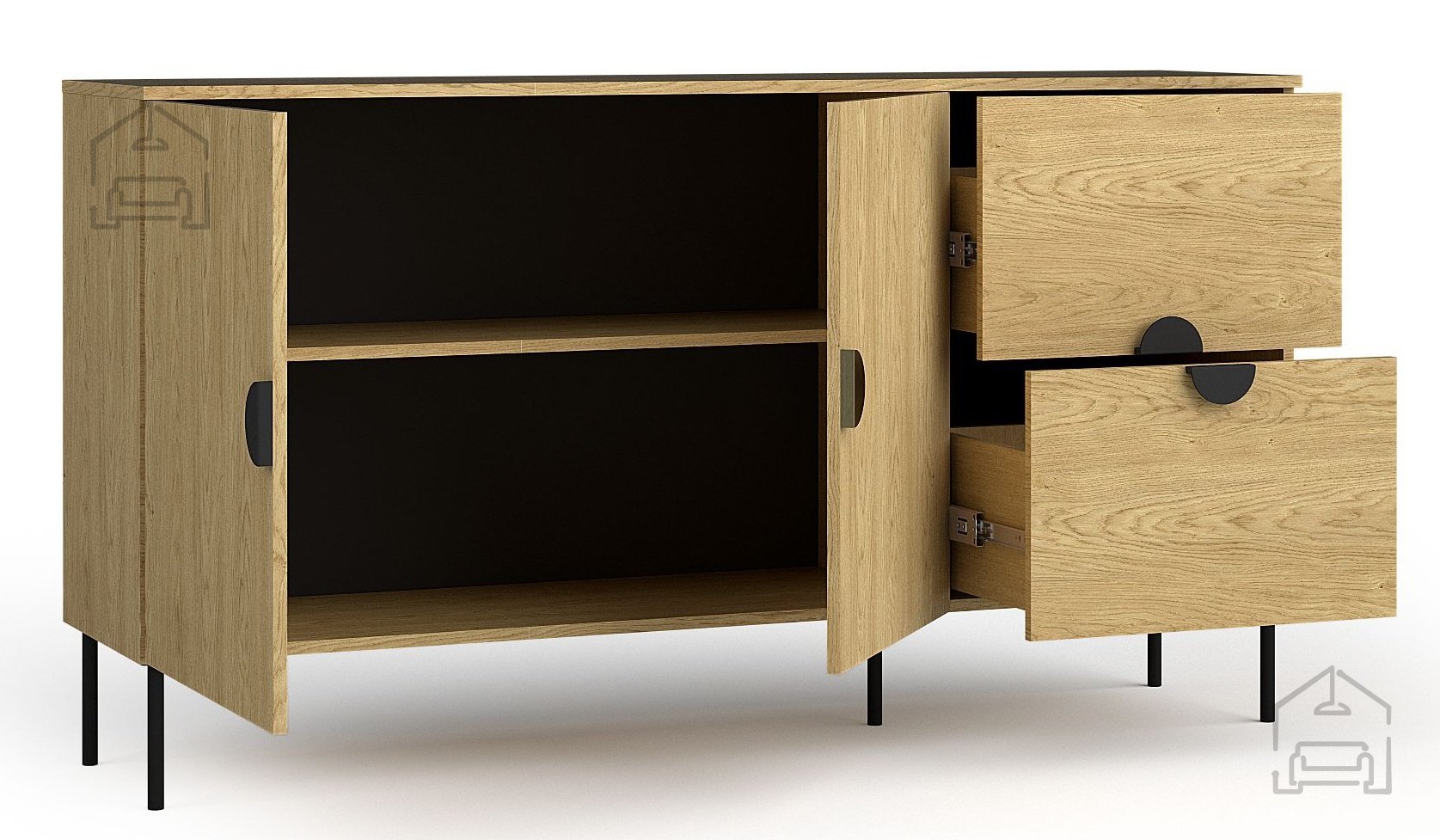 Die Oberfläche aus hochwertiger laminierter Platte mit einer Stärke von 16 mm sorgt für Langlebigkeit und einfache Reinigung, während die raffinierten ABS-Kanten mit einer Stärke von 0,5 mm zusätzlichen Schutz vor Stößen bieten und die Lebensdauer der Möbel verlängern. Der warme Eichenton schafft eine angenehme und gemütliche Atmosphäre, während schwarze Metallelemente einen Hauch moderner Eleganz verleihen. Metallgriffe und -füße sind nicht nur ein ästhetisches Detail, sondern auch ein Garant für Stabilität und dauerhafte Nutzung.