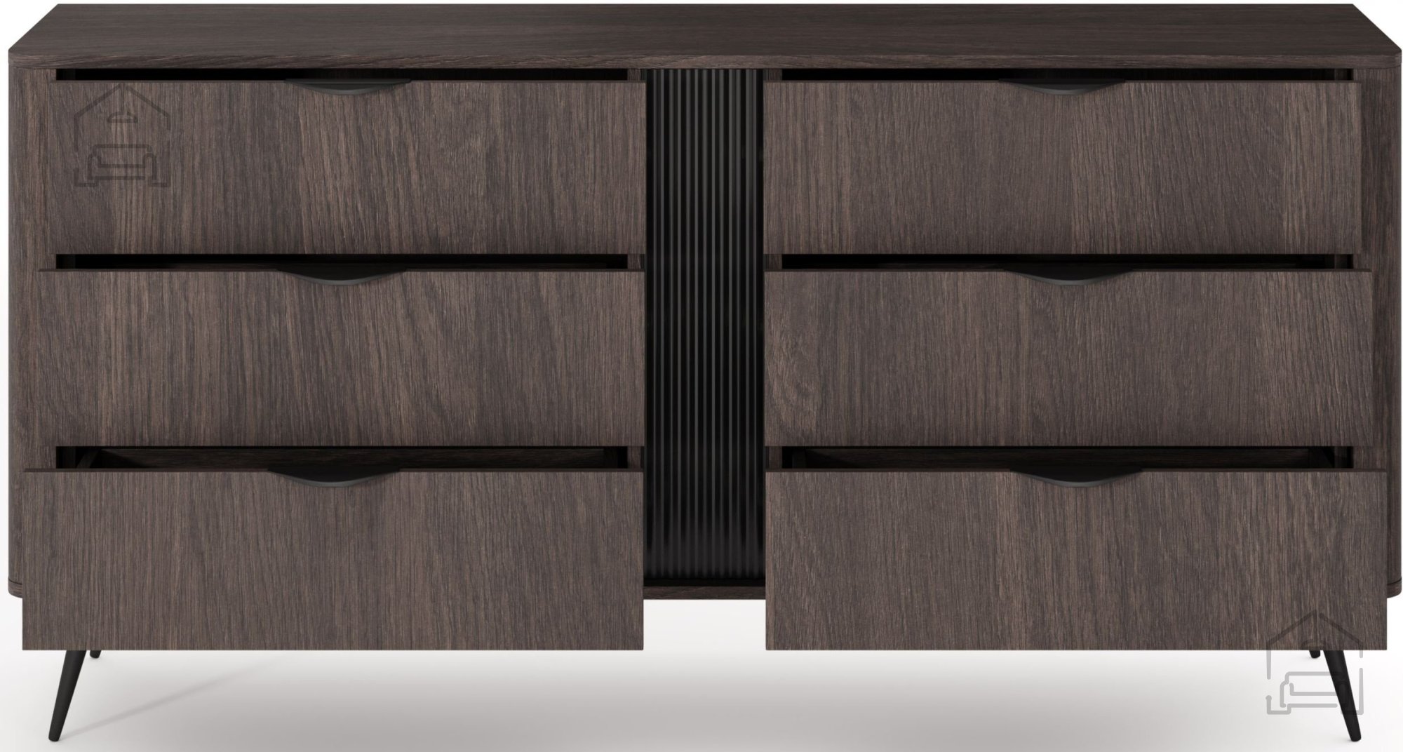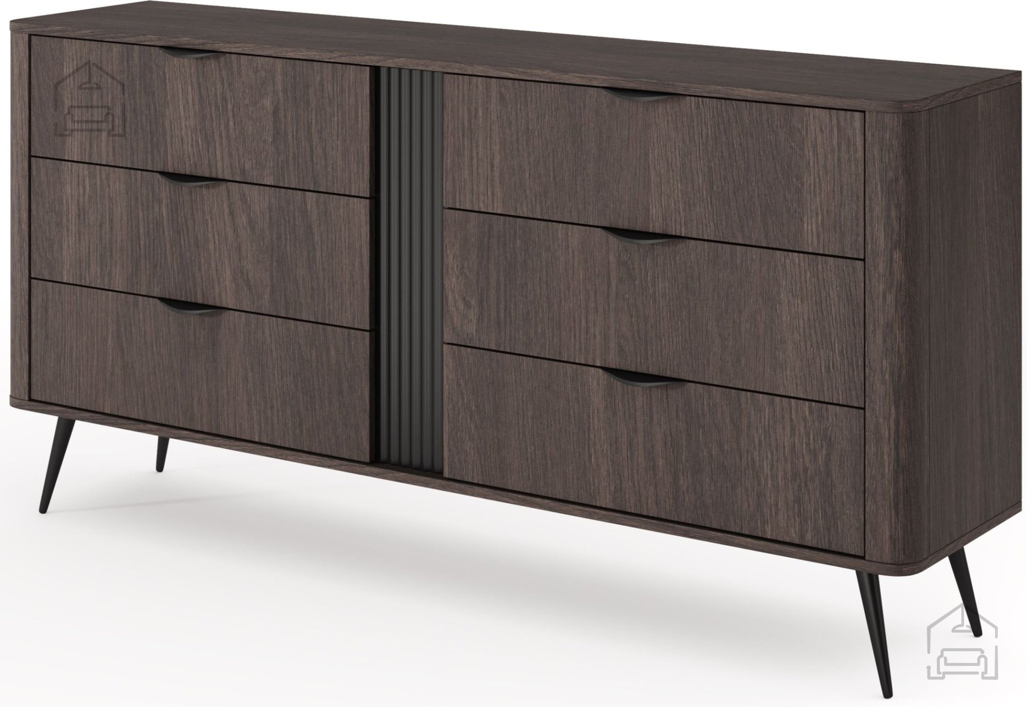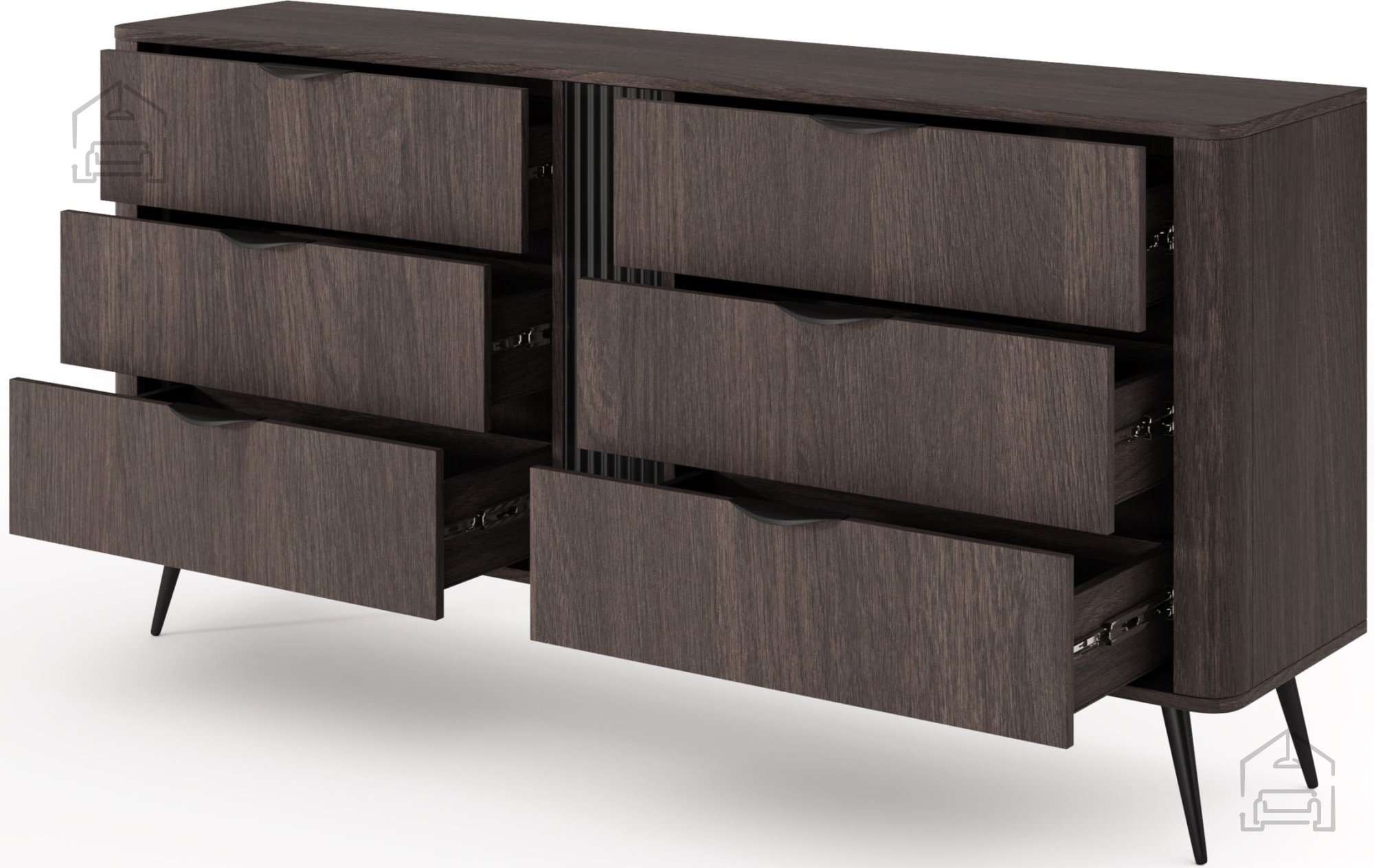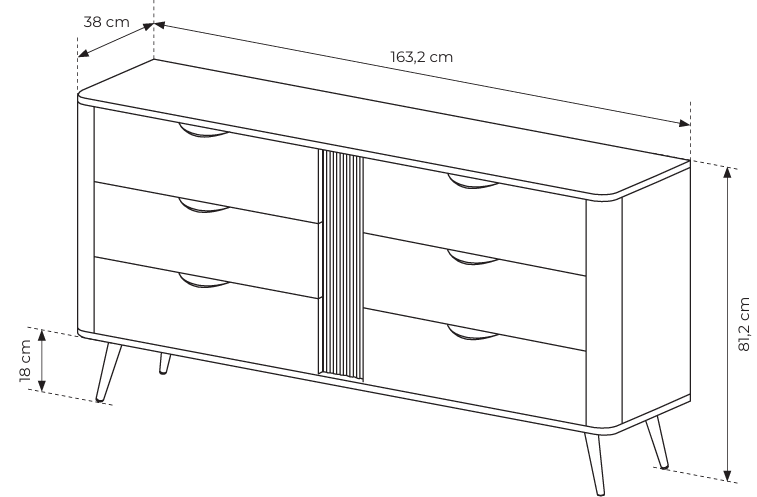 Der Korpus besteht aus 16 mm starker, laminierten E05-Spanplatte, ergänzt durch abgerundete MDF-Leisten an den Seiten und einer Nuteneinlage aus 18 mm starker MDF-Platte. Die Fronten sind ebenfalls mit Platten aus laminierter E05-Spanplatte verziert, die in einem wunderschönen Farbton der Wiener Eiche ein Gefühl von Wärme und Behaglichkeit schaffen. Metallgriffe und -füße in elegantem Schwarz verleihen einen Hauch von Modernität und schaffen einen subtilen Kontrast, der die Kommode noch ansprechender macht.