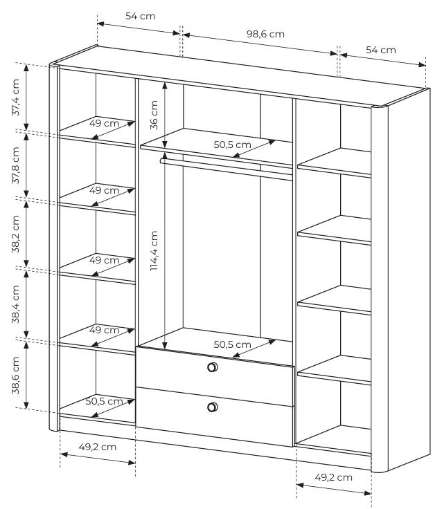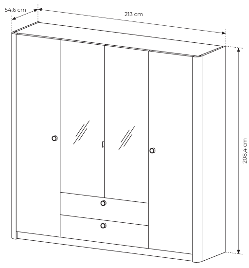 Mit den Maßen 213 x 54,6 x 208,4 cm bietet dieser Kleiderschrank ein optimales Verhältnis zwischen Geräumigkeit und Kompaktheit. Im Inneren finden Sie eine Kombination aus Regalen, Hängefläche und Schubladen, die eine übersichtliche Aufbewahrung verschiedener Kleidungsstücke ermöglichen. Die Schubladen sind mit Kugelführungen mit Vollauszug ausgestattet, was ein sanftes und leises Öffnen sowie einen vollständigen Zugriff auf den Inhalt ermöglicht. Die weiße HDF-Rückwand und die Schubladen schaffen einen hellen Kontrast, der das Innere noch übersichtlicher macht.