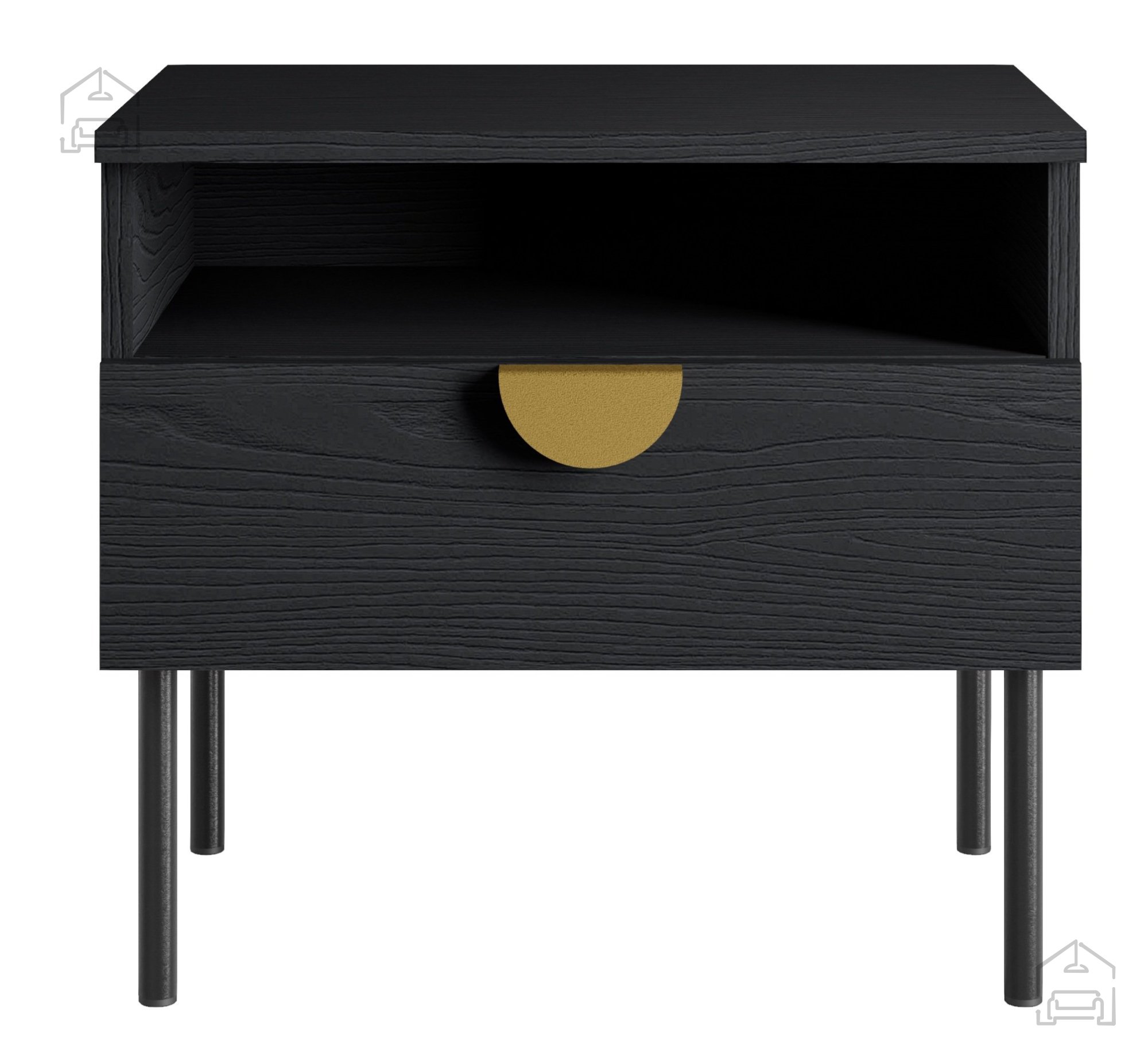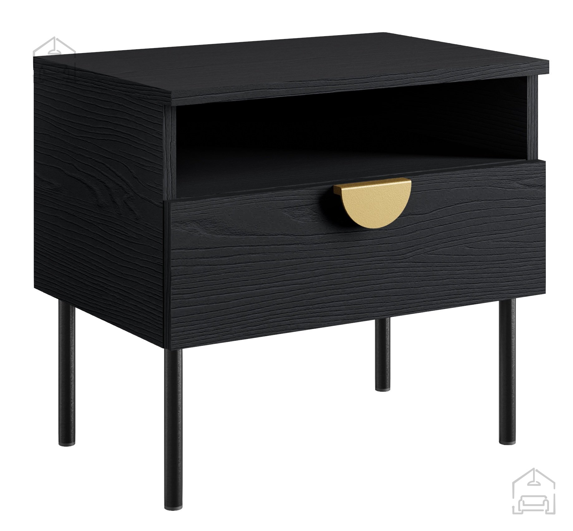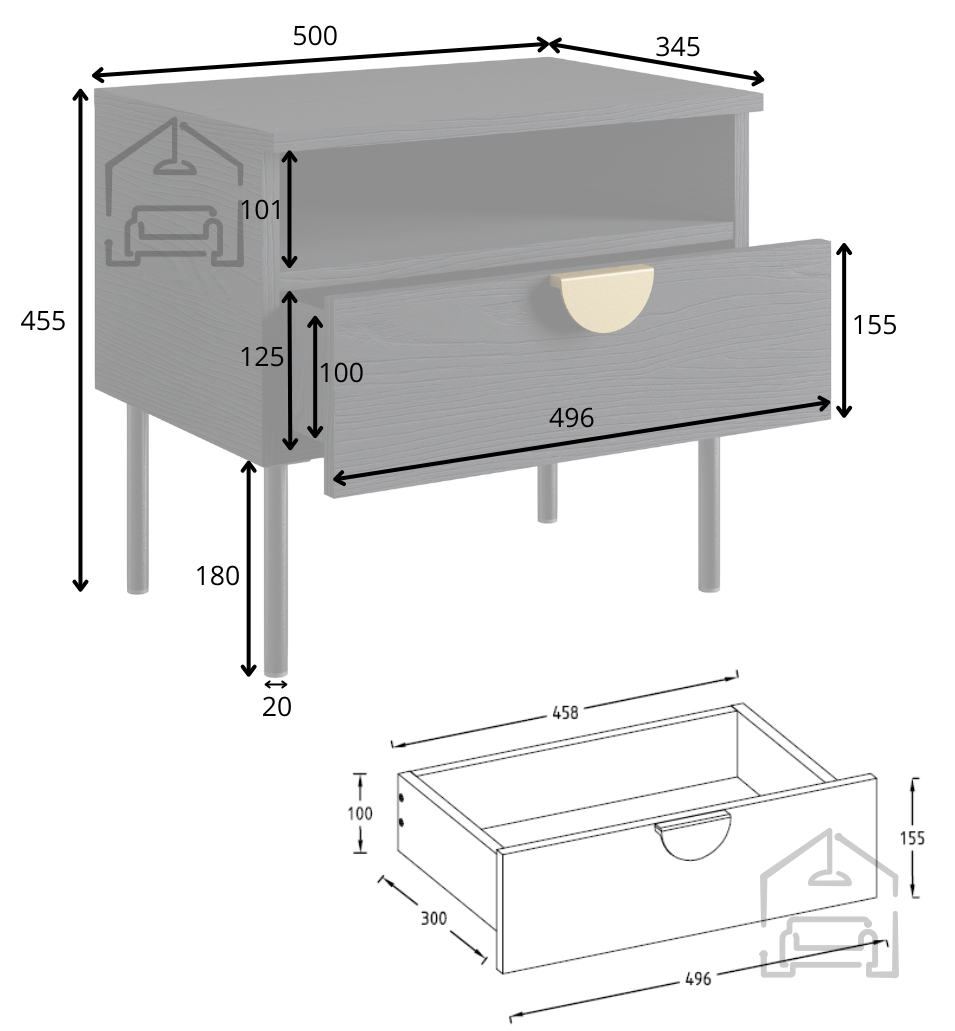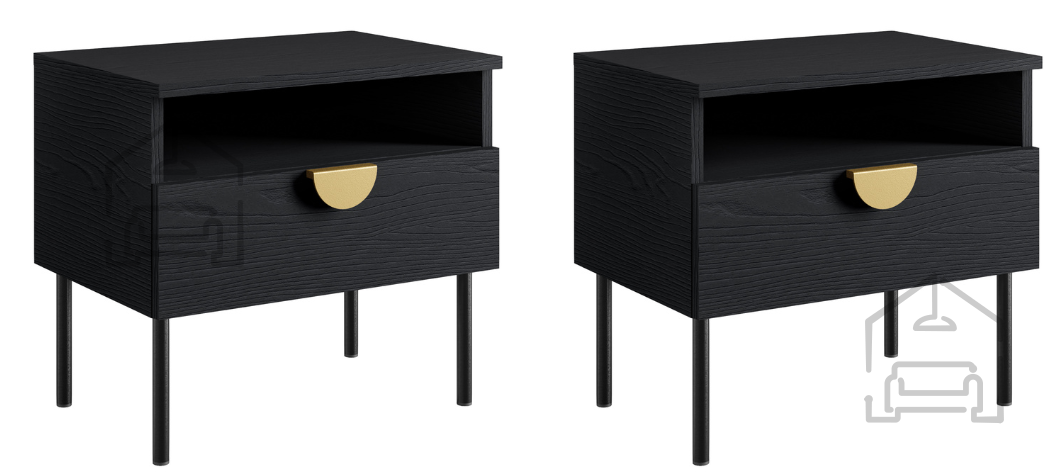 Jeder Nachttisch im Set besteht aus einer strapazierfähigen 16 mm laminierten Platte, die eine lange Lebensdauer und einfache Pflege garantiert. Die Kanten sind mit einem 0,6 mm und 1,0 mm dicken ABS-Band geschützt, was die Stoß- und Abriebfestigkeit erhöht. Die Rückwand aus 3 mm HDF-Platte sorgt für Stabilität der Konstruktion, während die Metallgriffe in Goldfarbe einen Hauch von Raffinesse verleihen. Metallfüße in Schwarz sorgen für Stabilität und verleihen gleichzeitig der gesamten Struktur optische Leichtigkeit.