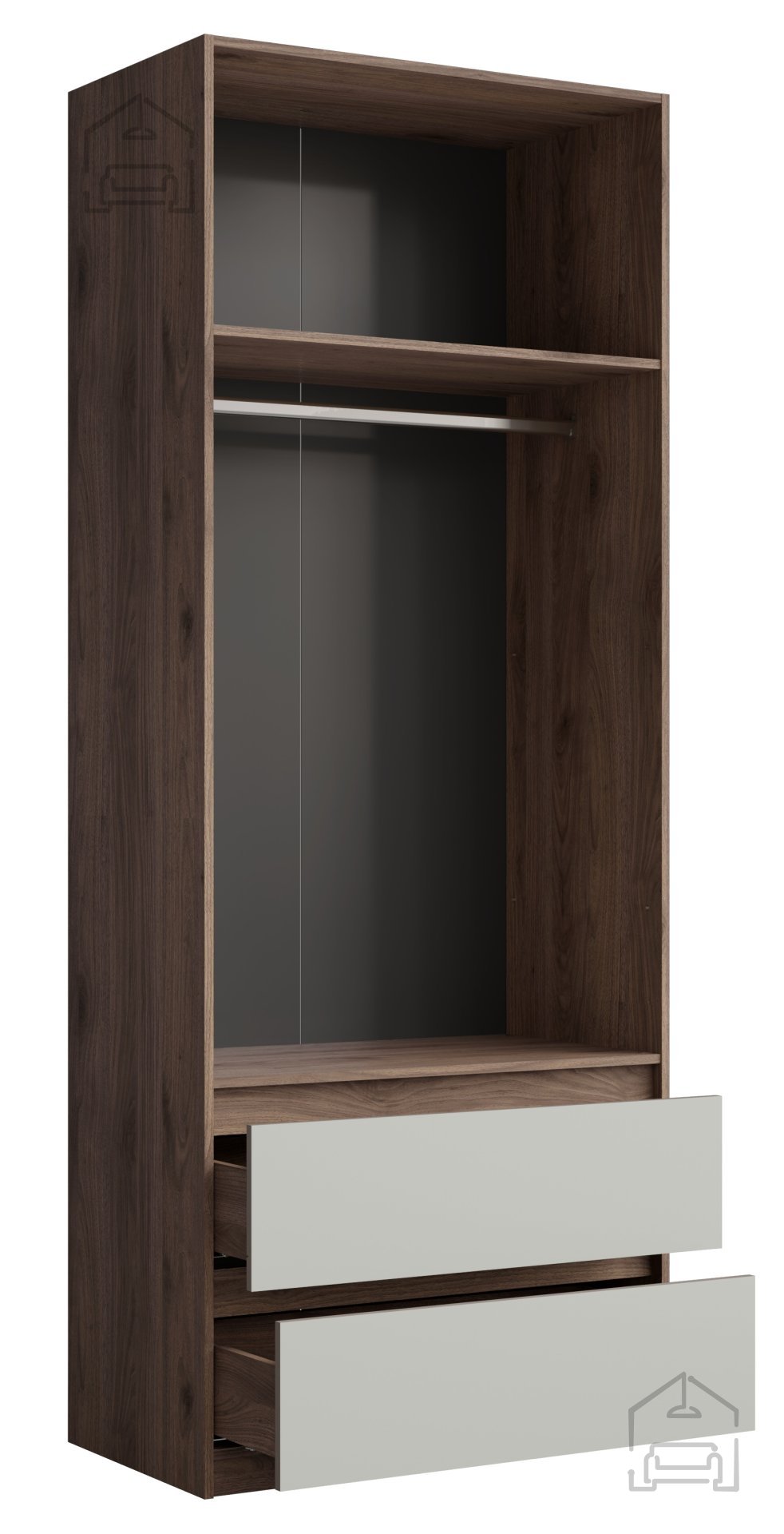 Mit zwei geräumigen Türen (2D) und zwei praktischen Schubladen (2SZ) ermöglicht der Schrank eine getrennte Aufbewahrung verschiedener Arten von Kleidung und Accessoires. Auf dem oberen Regal und der Kleiderstange können Sie problemlos saisonale Kleidung, Hemden, Mäntel oder Kleider verstauen, während die Schubladen ideal für kleinere Stücke sind – von Unterwäsche bis hin zu Modeaccessoires und Dokumenten. Eine solche Innenaufteilung sorgt dafür, dass Sie immer alles griffbereit und schön organisiert haben.