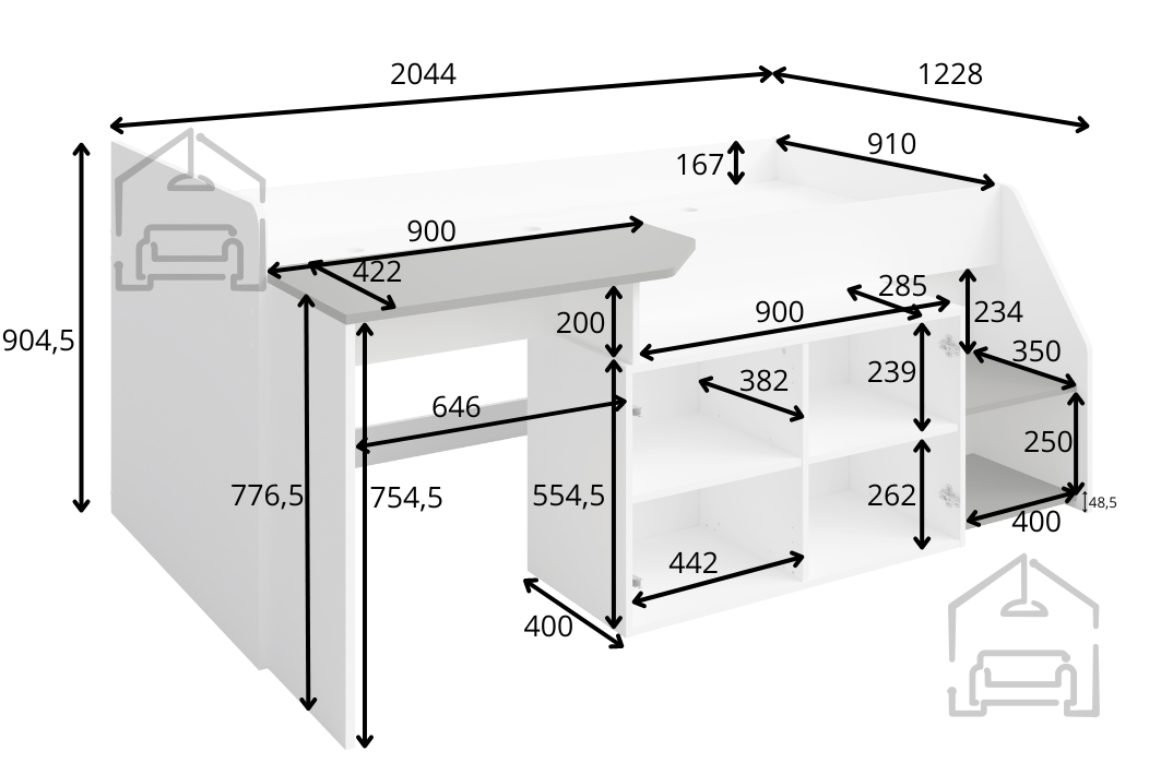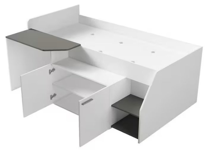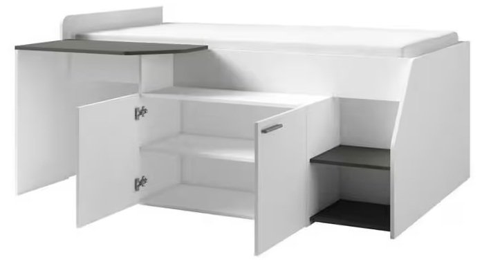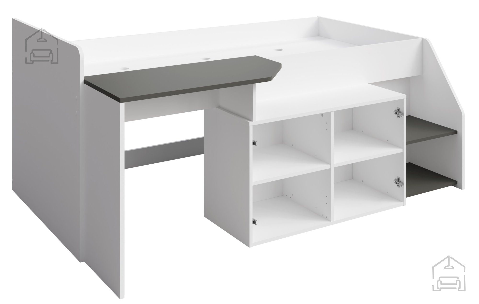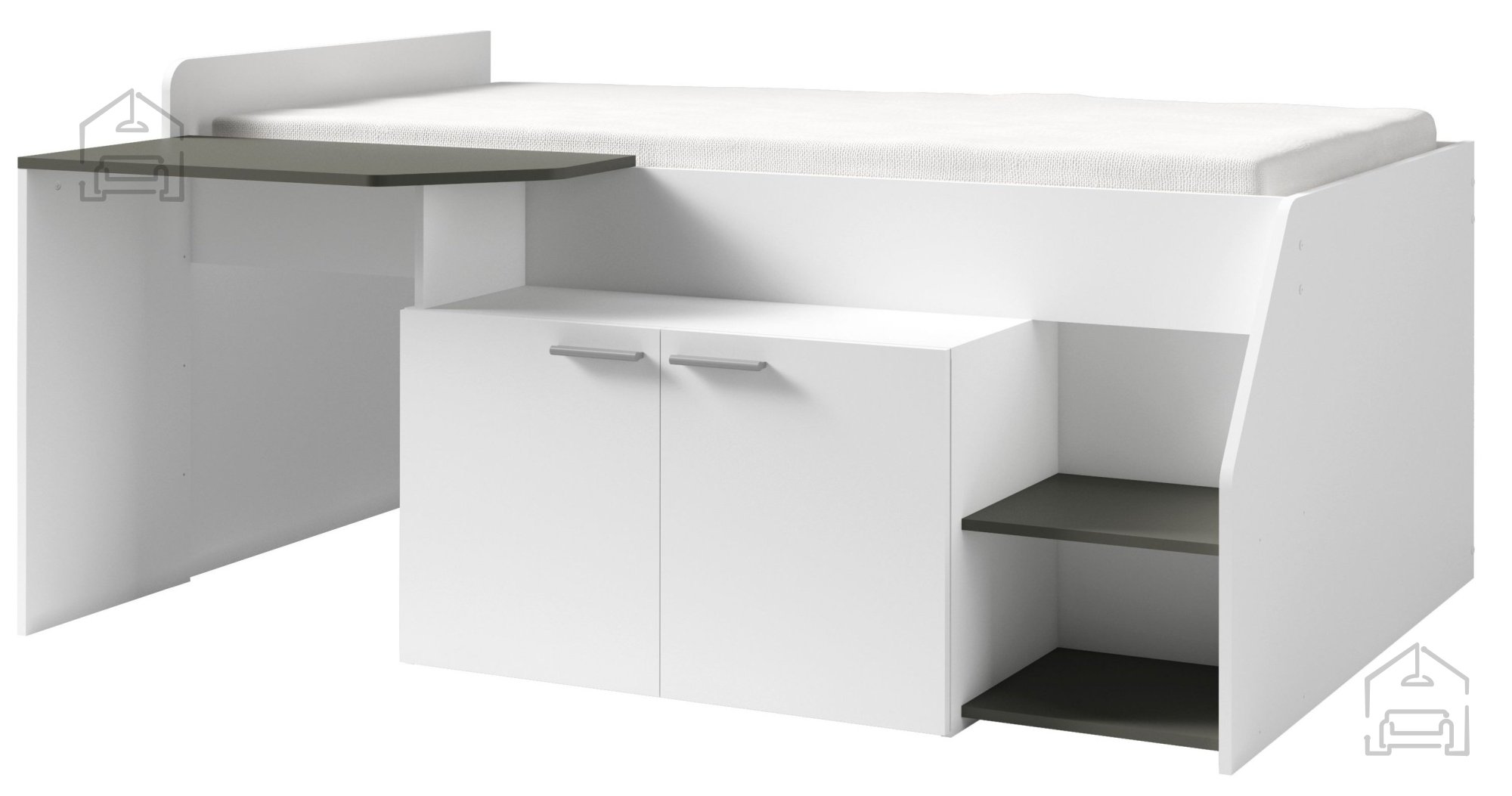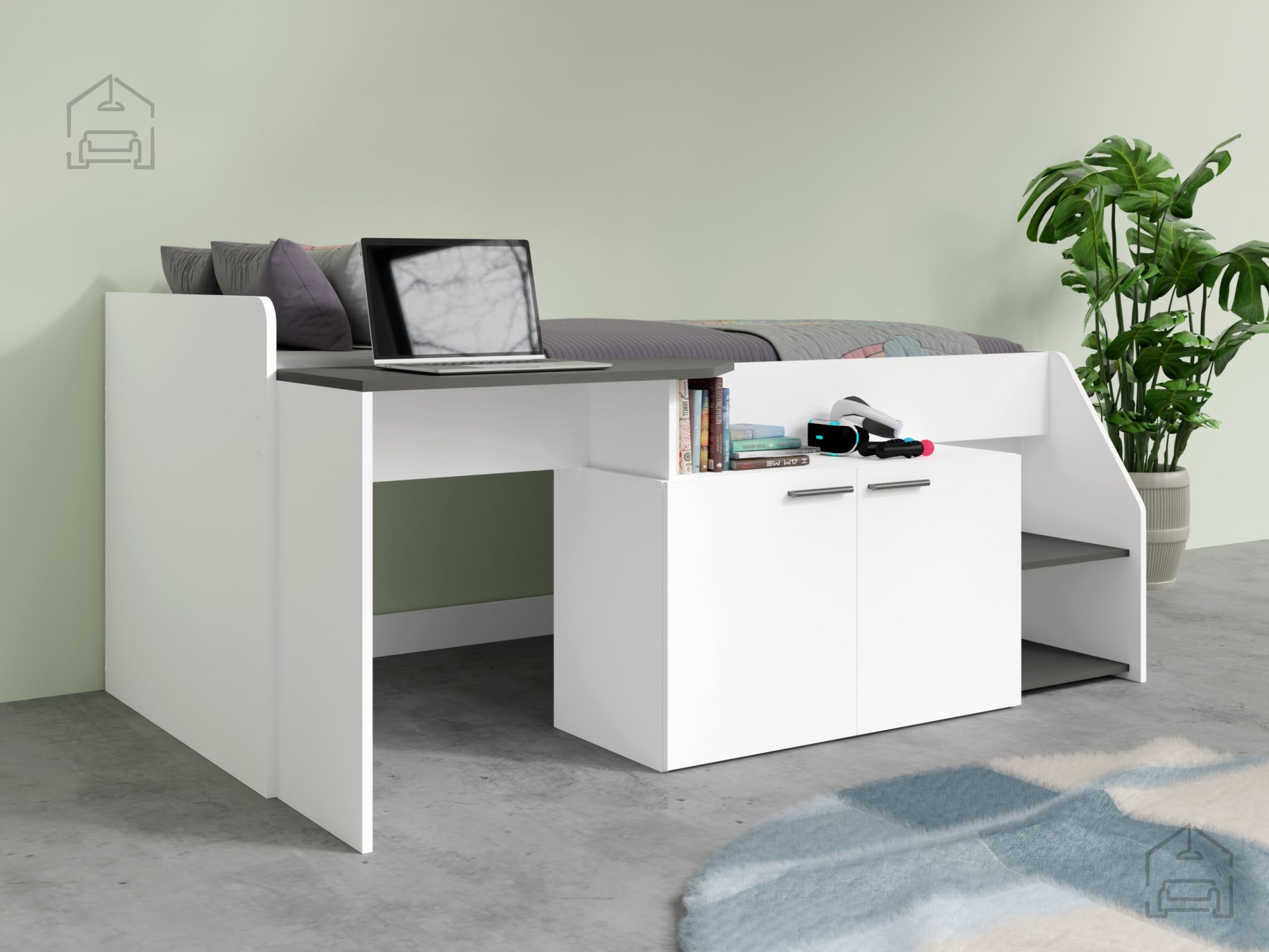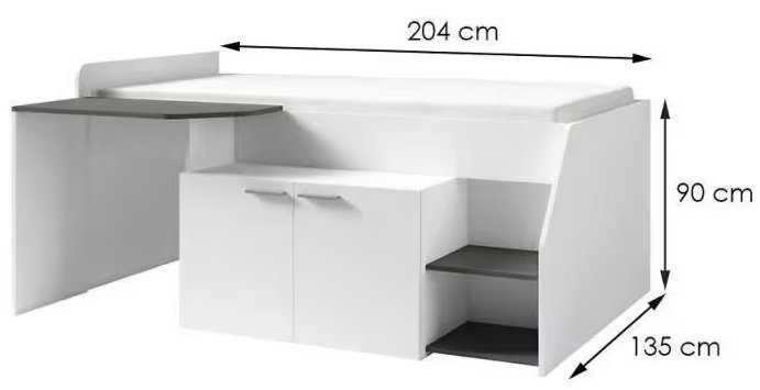 Die Maße 135x204x90 cm ermöglichen, dass sich das Möbelstück problemlos auch an kleinere Räume anpasst, ohne dabei Komfort oder Stauraum zu opfern. Die Kombination aus Weiß und Grau bringt ein modernes, aber zugleich neutrales Erscheinungsbild, das sich leicht mit verschiedenen Einrichtungsstilen kombinieren lässt – von minimalistisch bis hin zu einem verspielteren Jugendambiente. Dank der 3-in-1-Funktionalität erhalten Sie ein Bett für ruhigen Schlaf, einen Tisch für Schulaufgaben oder kreative Arbeit sowie einen Schrank für Kleidung, Schulutensilien oder persönliche Gegenstände.