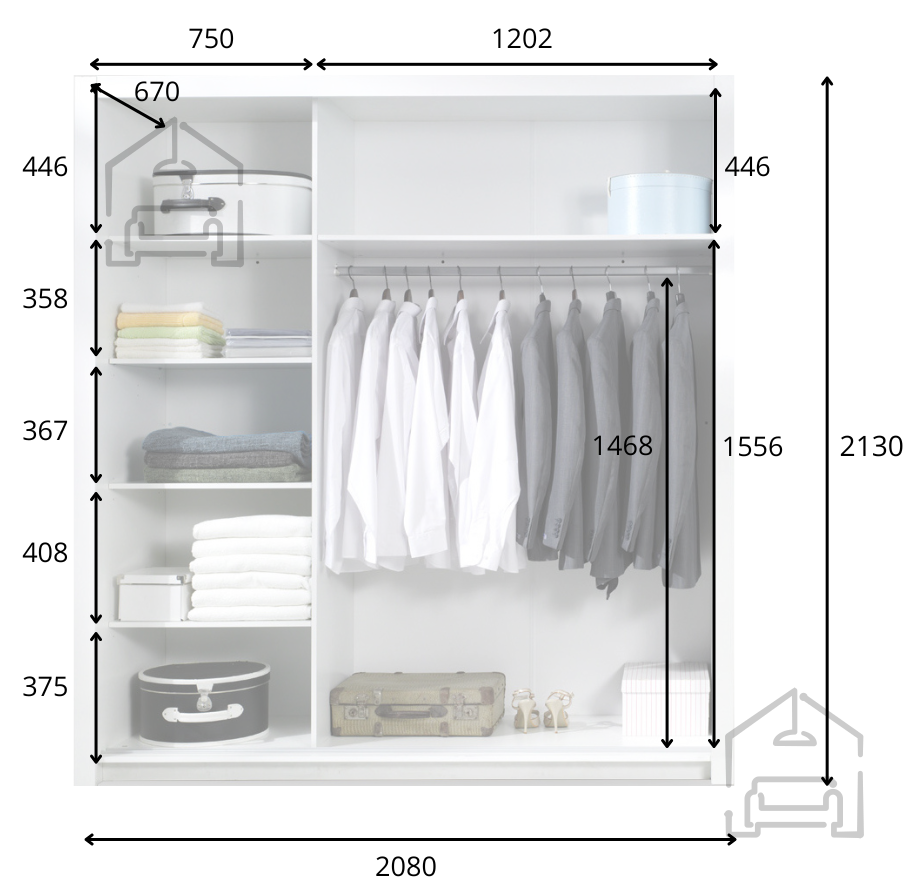 Die Maße des Schranks 208x67x213 cm ermöglichen die Aufbewahrung einer großen Menge an Kleidung, Schuhen und Accessoires. Das Innere ist so gestaltet, dass es eine Kombination aus Regalen, Schubladen und Platz zum Aufhängen von Kleidung bietet. So behalten Sie immer den Überblick über Ihre Garderobe, alles ist ordentlich und griffbereit. Kugelgeführte Schubladenschienen sorgen für ein sanftes und leises Öffnen, was den Bedienkomfort erhöht.
