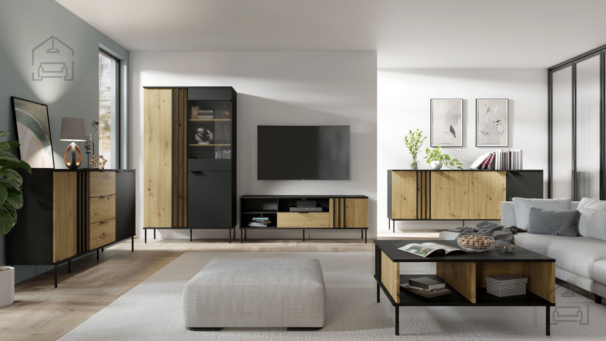 Die perfekte Kombination aus Eleganz und Funktionalität für Ihr Zuhause – dieses moderne Wohn- und Esszimmer-Set wird Sie mit seinem minimalistischen und zugleich warmen Design begeistern. Es verbindet eine raffinierte schwarze Farbe mit einem natürlichen Artisan-Eichen-Ton und schafft so einen harmonischen Kontrast, der sowohl in kleinere als auch größere Wohnungen hervorragend passt. Mit sorgfältig ausgewählten Materialien und ausgearbeiteten Details sorgt es für komfortables Wohnen und eine angenehme Atmosphäre im Raum.